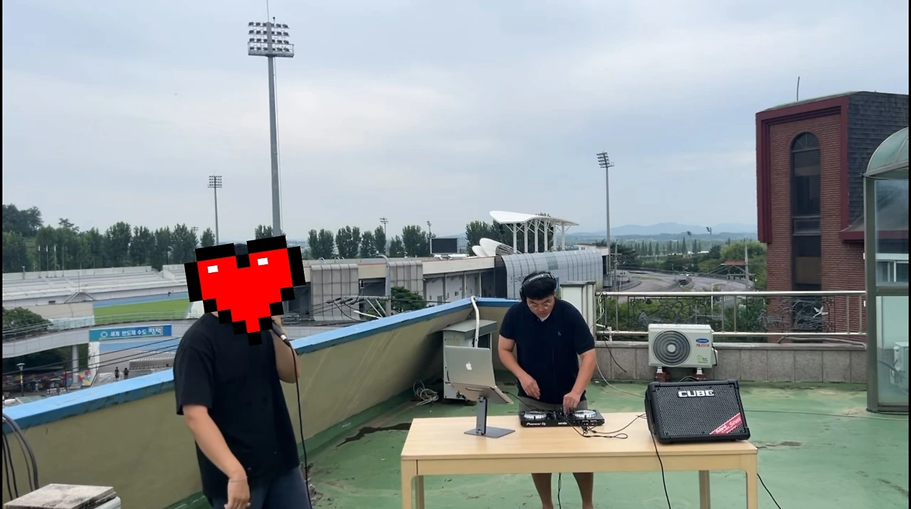 그렇게 2시간 여를 곡 하나의 하울링과 딜레이에 문제가 생겨 씨름하다 과부하가 걸려 잠시 쉬는 시간을 갖기로 했다. 때마침 호스트를 보던 동생이 옥탑방에 좋은 버스킹 마당이 있다며 소개해줬다. 날씨도 기분도 아무튼 이래저래 좋았던 관계로 바로 장비를 세팅하고 각자 좋아하는 음악을 골라 즉석에서 공연을 진행했다. 디제이를 맡은 나는 곡의 bpm을 체크해서 간단히 믹스 셋을 구성한 뒤 15분간 플레이를 하며 함께 공연 분위기를 돋우는데 일조했다. 그렇게 한바탕 하고 나니 기다렸다는 듯 소나기가 내렸고 우리는 그렇게 다시 믹싱 작업의 늪으로 들어갔다.