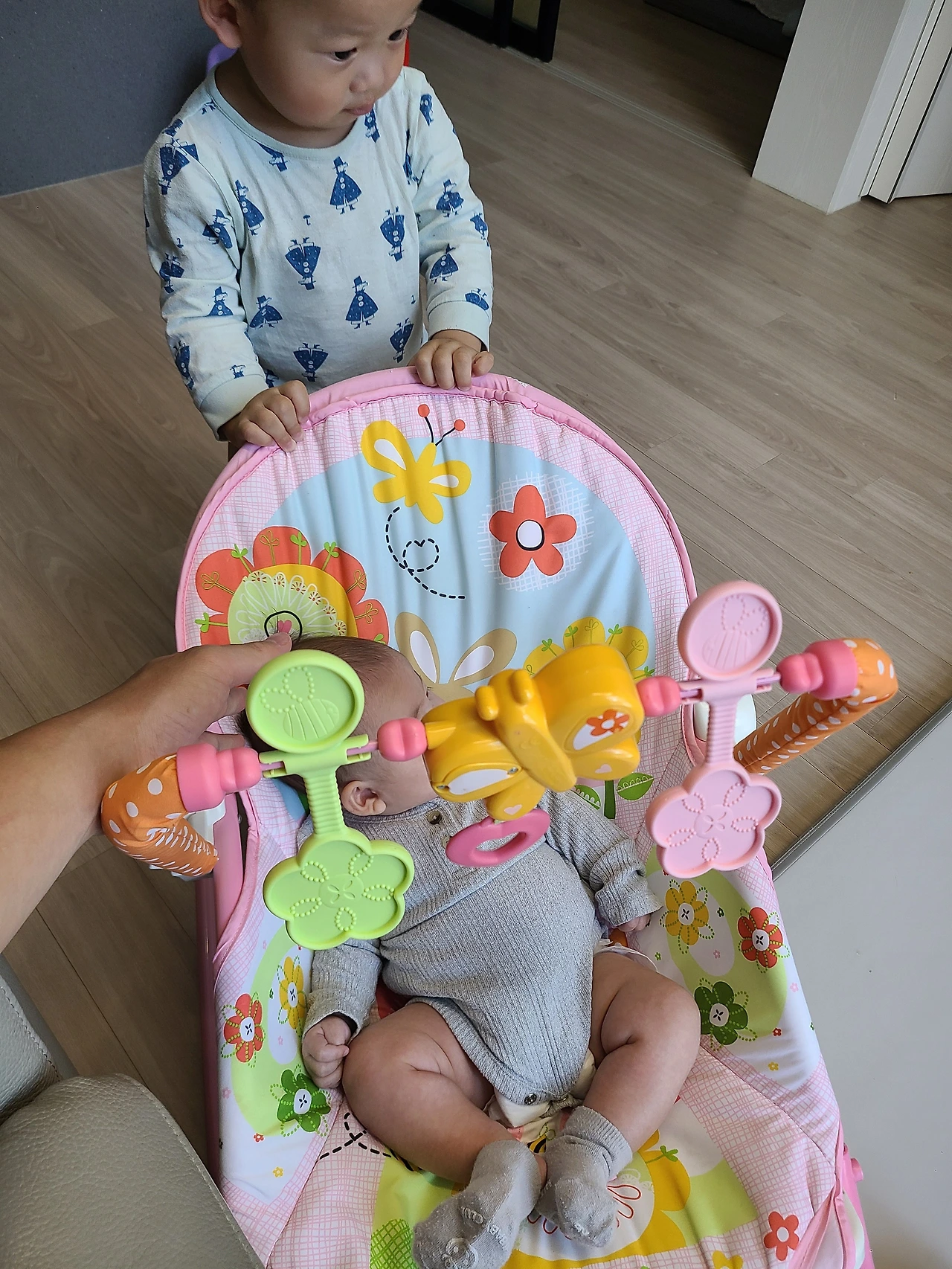 두 번째 차이점은 발달하는 근육의 종류와 놀잇감에 대한 태도였다. 첫째는 대근육 위주로 성장이 시작되다 보니 허리와 허벅지가 우선적으로 발달했다. 그래서 그런지 '쏘서', 아기체육관 등 몸을 쓰는 활동을 해야 직성이 풀리는 성격이었고 우리 부부는 당연히 첫째의 기억이 있기에 둘째에게도 같은 놀잇감을 제공해서 놀게 했다. 그러나 이게 웬걸. 조금 갖고 노는 것 같더니 이내 손으로 팽 치며 관심이 없다는 듯한 눈길을 보낸다. 둘째는 딸이라서 그런지 모르겠지만 소근육이 우선적으로 발달하여 머리띠, 모빌 등에 더 관심이 많았던 것이다. 그리고 본인이 놀잇감을 적극적으로 가지고 놀기보다는 놀잇감으로부터 편하게 휴식을 취하려는 제스처가 훨씬 많았다. 그래서 둘째는 100일 즈음까지 주로 '바운서'에서 누워 세상을 관조하는 것을 좋아했고 첫째는 그런 둘째와 함께 놀아주기 시작했다.