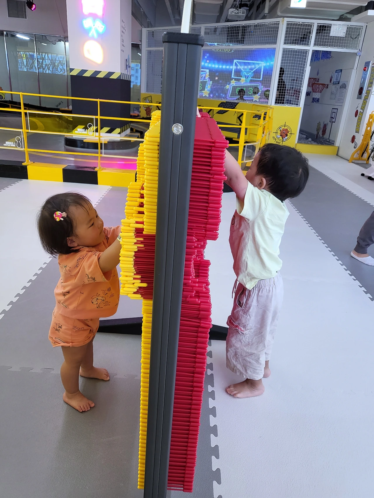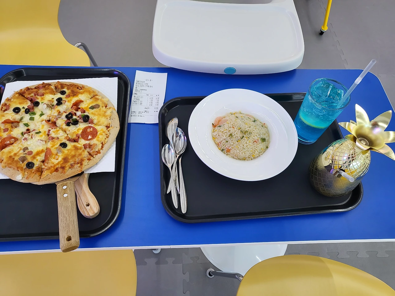 50분간 고속도로를 달려 의정부에 있는 키즈카페에 도착했다. 기본이용 시간이 다른 키즈카페에 비해서 비싸 조금 당황스러웠지만 규모가 큰 만큼 신기한 액티비티가 많아서 아이들이 즐기기에 좋았다. 우리 아이들은 키즈카페에 나름 일가견이 있어 방방, 편백나무 존, 간이볼풀 존 등은 익숙한데 요 볼펜 놀이기구는 처음 보는 것이었다. 서로 다른 색깔의 펜 모양을 밀고 당기며 단순한 놀잇감인데 어찌 된 영문인지 이 기구만 20분 넘게 가지고 놀았다. 식상함 속에서 찾은 오아시스 같은 존재라 느꼈을까. 첫째, 둘째가 그렇게 오붓한 시간을 보내고 있을 무렵, 난 미리 사람들이 몰리기 전에 점심 메뉴를 주문하러 카페테리아로 갔다.
