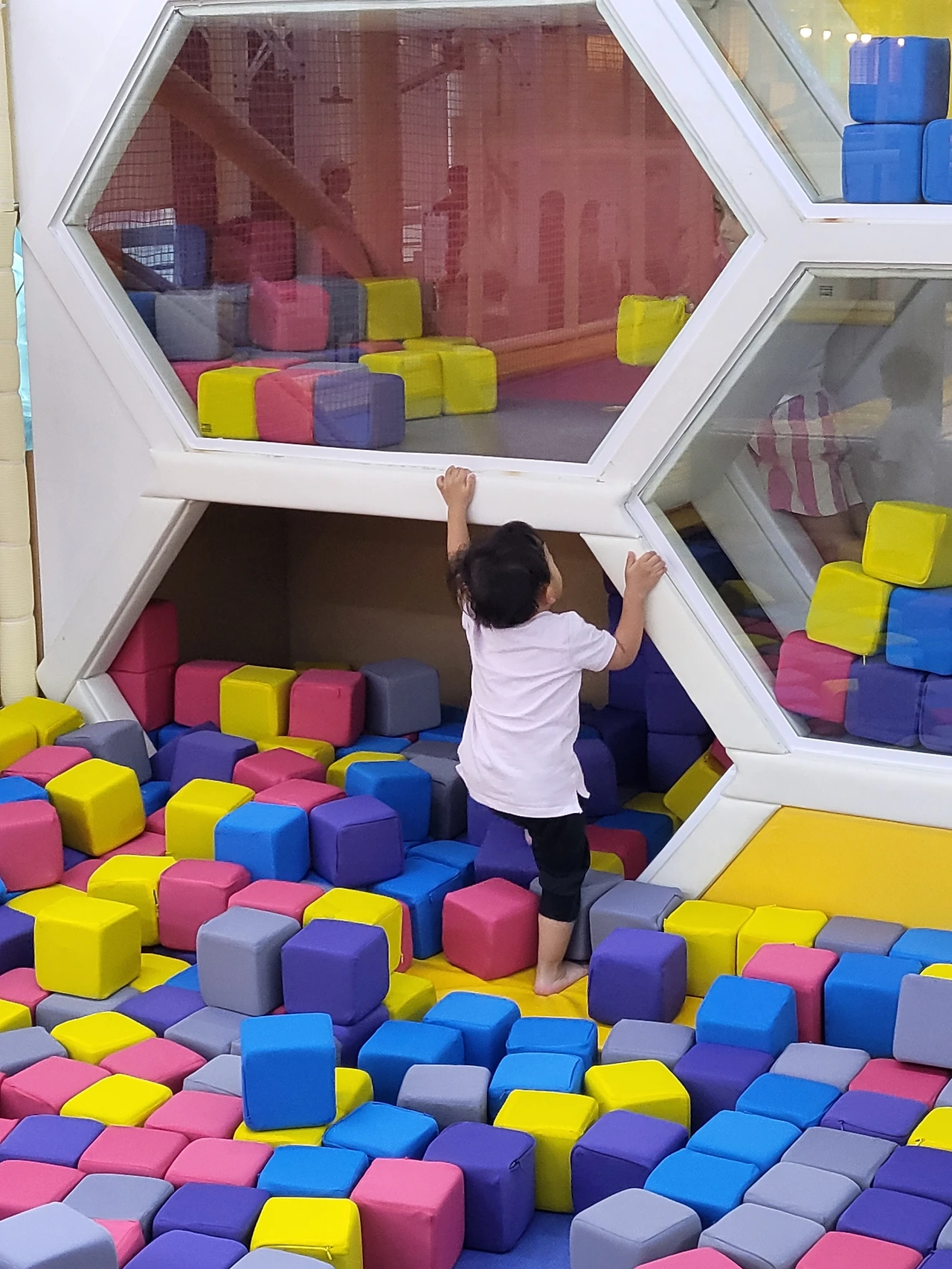 벌집 모양의 공간에서 블록들을 가지고 놀기도 하고 연결 통로들을 오르내리며 꼬불꼬불한 미끄럼틀을 타고 놀기도 했다. 주 고객층이 6살인지라 우리 아가들은 오늘도 막내뻘을 벗어나지 못했지만 질서 정연하게 다치지 않고 잘 놀았다. 가장 끝쪽 공간에는 시장놀이를 할 수 있는 공간도 있어서 역할놀이를 함께 하며 시간을 보내기도 했다.