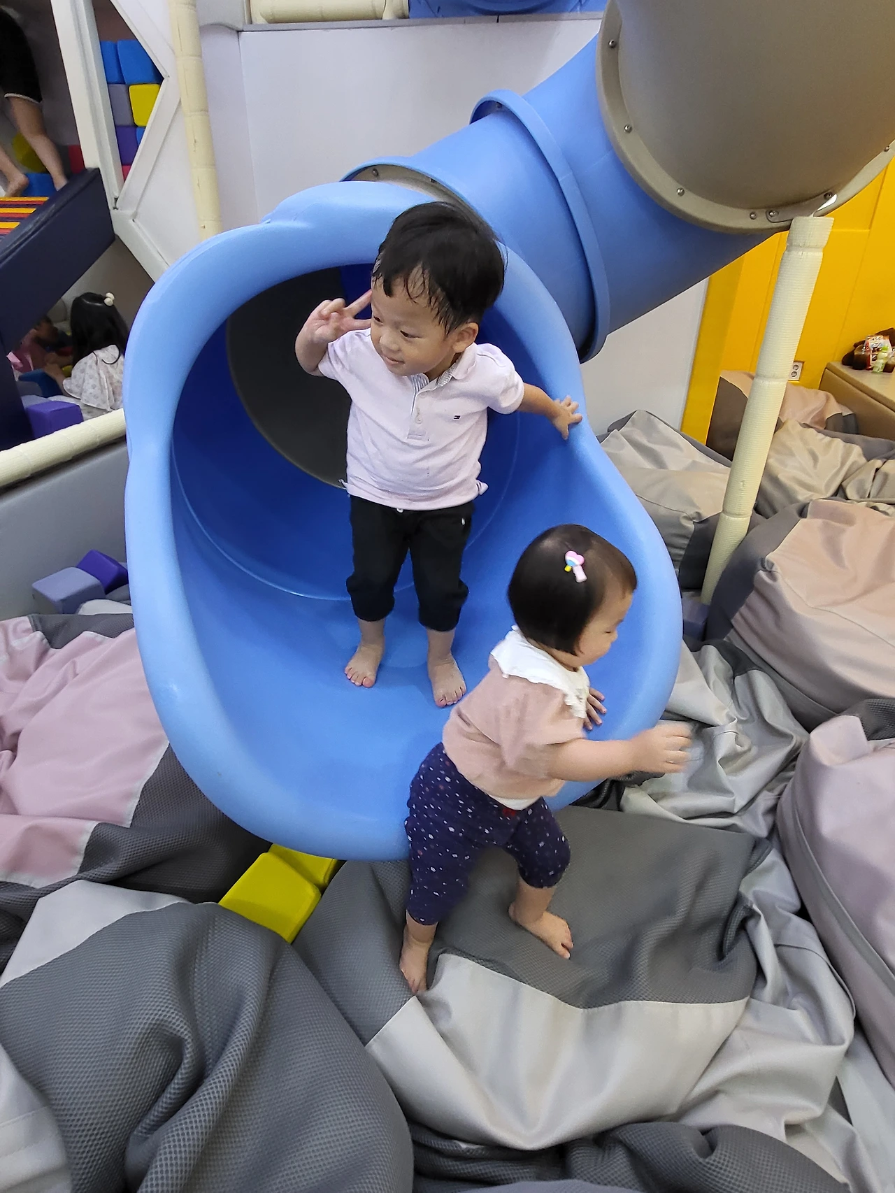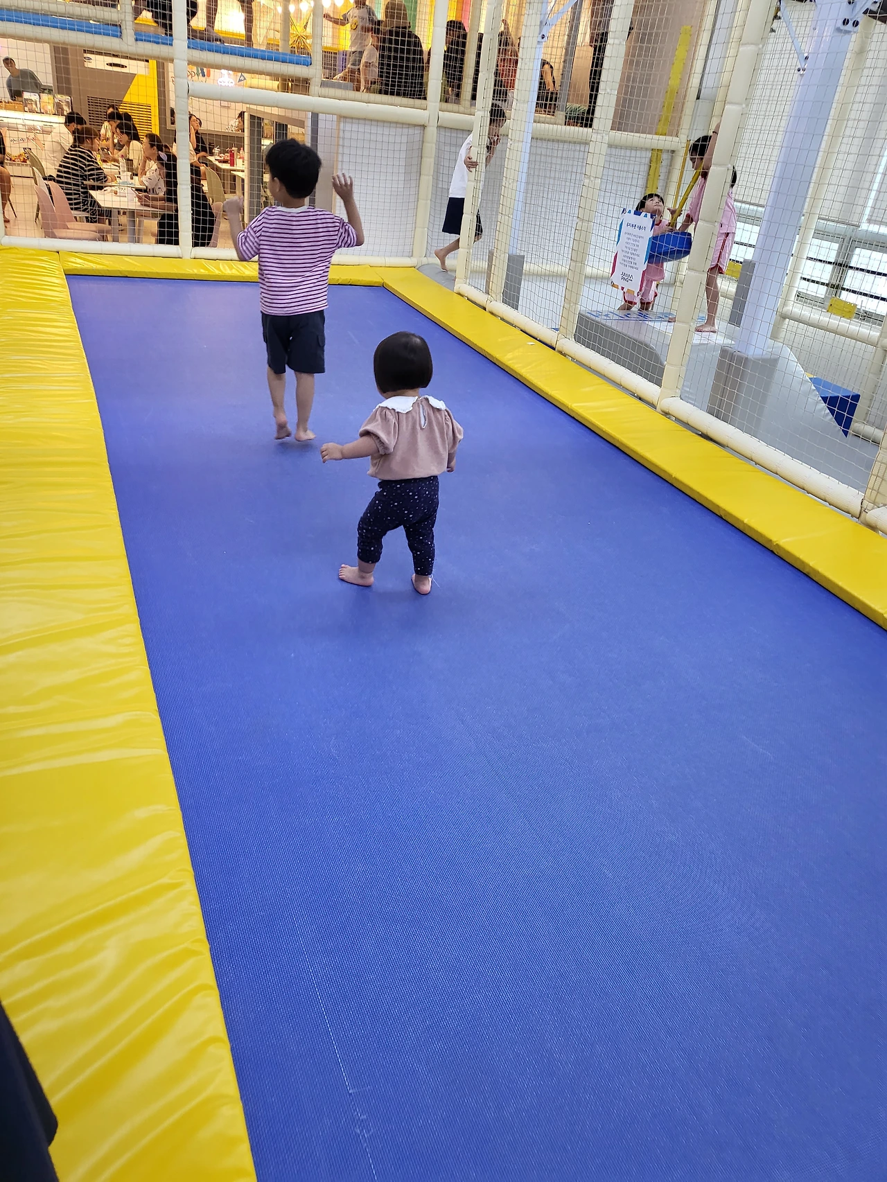 시간이 많이 흐르긴 흘렀는 모양이다. 예전에 다니던 헬스장의 흔적은 눈 씻고 찾아봐도 없다. 노란색을 잔뜩 머금은 시설물들 사이로 신나게 뛰어노는 아이들과 학부모들의 모습만이 존재했다. 입구에 도착하자마자 몹시 흥분한 우리 아가들을 달래며 차근차근 '점핑파크'를 즐겨보기로 했다. 타이틀에 걸맞게 가장 눈에 띄는 것은 트램펄린 시설들이었다. 수십 개의 키즈카페를 다녀본 우리 아가들에겐 이 정도는 튜토리얼 수준이었다. 첫 번째 진입 장벽을 이렇게 간단하게 극복한 아가들은 자율적으로 놀잇감을 탐색하며 놀기 시작했다.
