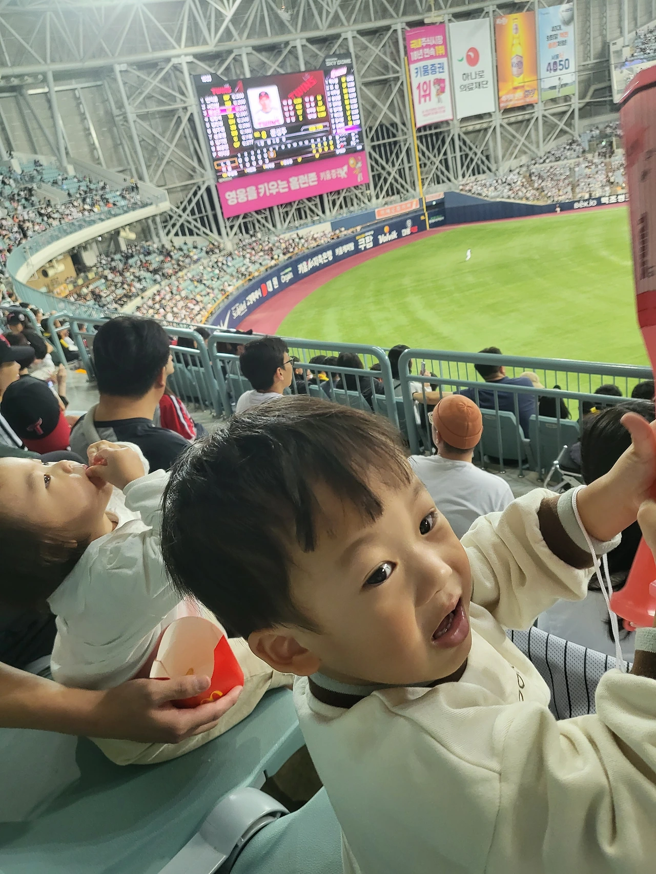 둘째보다 어느 정도 야구장의 분위기가 익숙한 첫째는 야구선수들과 공의 움직임에 대해서 나름 보고 들은 것을 잘 말해가며 경기를 관람하는 게 인상적이었다. '안타 ㅇㅇㅇ' 라던지 '날려 버려~' 등의 구호를 따라 하며 응원하는 모습을 보니 그새 꽤 많이 컸구나라는 생각을 했다. 먹성 좋은 둘째는 야구장 스낵 탐방에 눈을 떴는지 감자튀김, 구슬 아이스크림 한 통을 다 비우고도 오빠 것을 탐냈다. 그래도 누구 못지않게 열심히 박수를 치며 응원까지 해냈다. 그게 비록 상대팀의 공격이었을지라도.