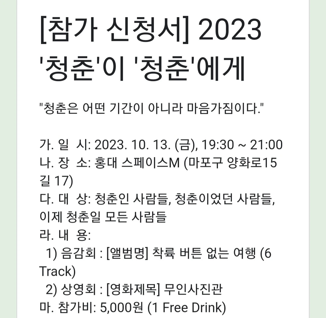 지난 금요일 밤, 앨범 발매를 기념하기 위한 작은 행사를 마련했다. 홍대 스페이스라는 장소를 대여한 후 간단하게 리플릿을 만들어 참가자를 모집했다. 초등교사 3인조 힙합그룹 '미립'을 정식으로 소개하고 우리가 만든 음악을 대중에게 처음 선보이는 자리였다. 이와 동시에 우리 팀 멤버 한 명이 주연으로 참여한 독립영화 '무인사진관'도 상영하는 뜻깊은 시간이었다.