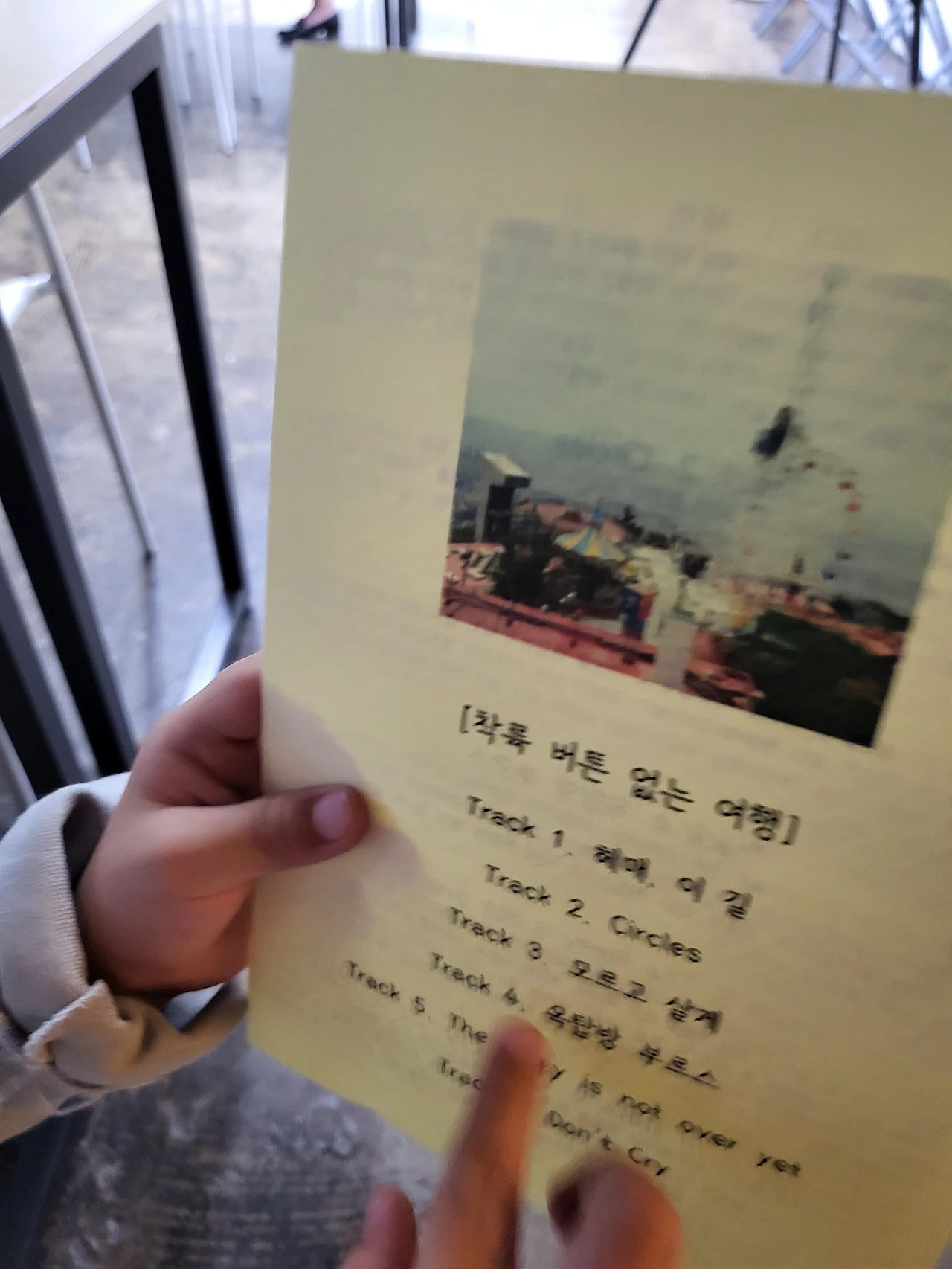 우리 앨범명은 '착륙 버튼 없는 여행'으로 청춘이라는 키워드를 각자의 입장에서 다양하게 랩으로 풀어낸 일종의 '시집'이다. 나는 앨범에서 1곡을 제외한 전 트랙에서 가사를 쓰고 랩을 했으며 다른 팀원들도 랩과 더불어 작곡, 믹싱&마스터링을 했다. 그야말로 전문가의 손길을 전혀 거치지 않은 순수 창작물인 데다 육아와 직장 생활 틈틈이 제작해 2년여 만에 완성시켰다는 것에 주안점을 뒀다. 엄연히 돈을 받고 진행하는 행사인 만큼 다과와 음료 세팅, 가사집 제작 등의 세심한 곳까지 팀원들이 신경 써주었다. 함께 도와주지 못한 대신에 행사 중에 소소한 장기인 디제잉을 선보여 팀원들의 노고를 치하하는데 만족했다.