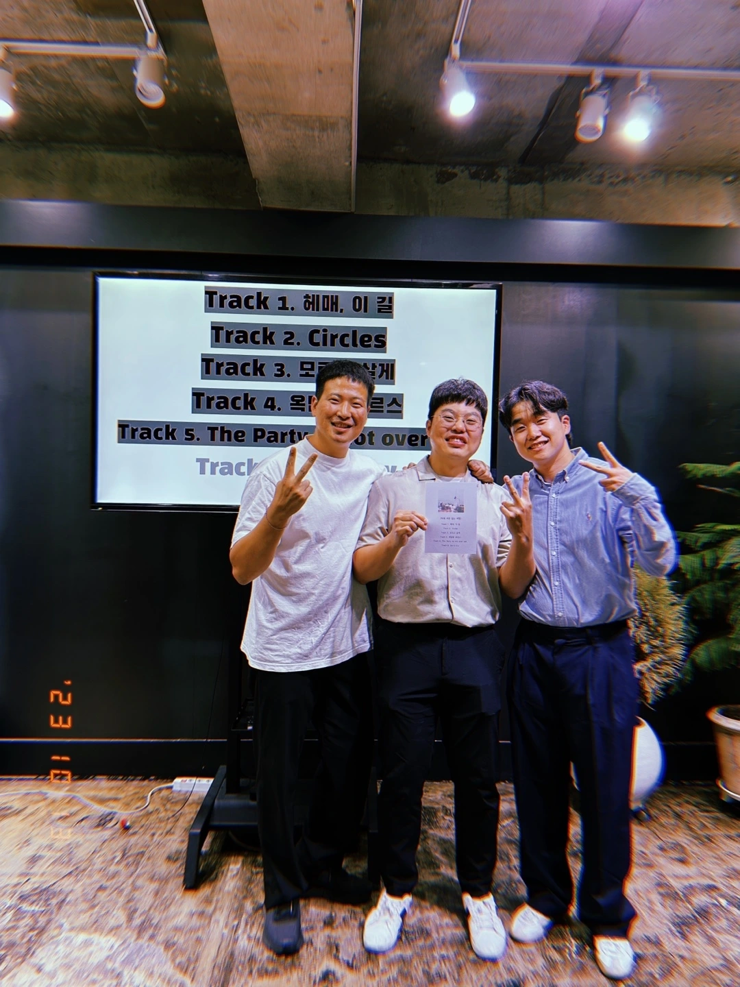 음감회를 우여곡절 끝에 무사히 마치고 간단히 팀원들과 오늘을 기념하는 포토타임을 가졌다. 교사모임에서 우연히 만나게 된 팀원도 있고 10년 넘게 같은 과 선후배로 알고 지낸 팀원도 있다. 알고 지낸 기간보다 중요한 것은 우리 셋 모두 힙합에 대한 가치관과 열정이 꾸준히 남아있다는 것. 오늘에서야 그러한 닮은꼴의 방점을 찍었다. 성공이나 부귀영화를 목적으로 했다면 오늘 같은 시간이 없었을지도 모른다. 좋아서 하던 취미를 꾸준히 연구하다 보니 우리의 소리를 누군가와 공유하고 싶었을 뿐. 그 마음 꾸준히 유지해서 앞으로도 더 좋은 음악 활동을 전개할 수 있기를.