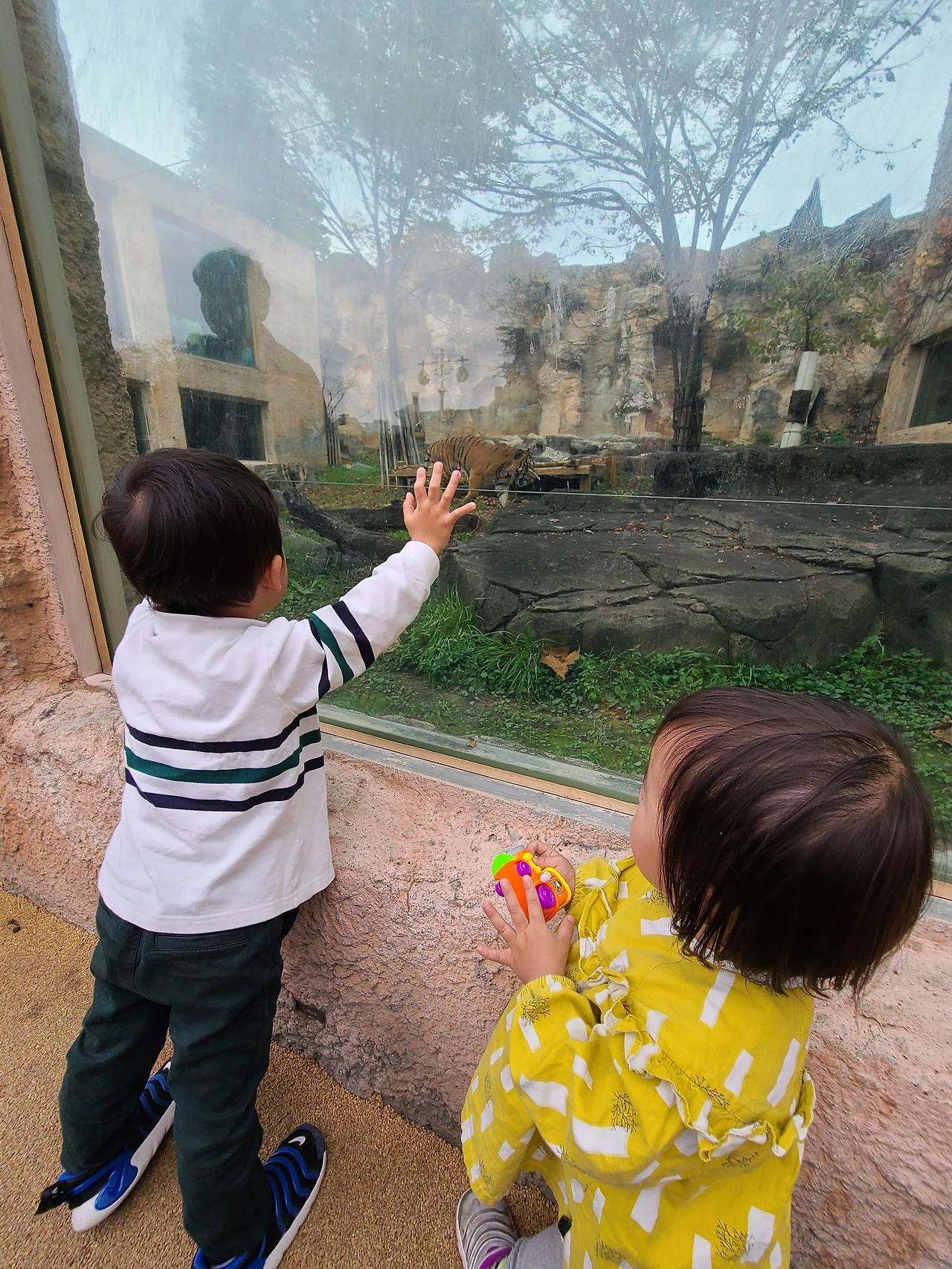 지난 주말, 동물원에 가고 싶다는 첫째의 말에 어린이대공원을 방문했다. 원래는 실내 동물원을 방문할 예정이었으나 놀이기구도 함께 타고 싶다는 추가 제안까지 고려하여 최종 선택은 '어린이 대공원'으로 정해졌다. 집에서 차로 30분이면 방문할 수 있고 인근 대학캠퍼스에 상대적으로 저렴한 가격으로 주차를 할 수 있어 방문하는 데 큰 무리는 없었다. 무엇보다 비 소식이 있기 직전 마지막 화창한 날일 수 있다는 소식을 듣고 무조건 실외 활동을 하기로 했고 그 선택은 탁월했다. 작년에 방문했을 때는 첫째가 동물을 무서워하고 둘째는 걸음마를 할 수 없어 관람에 다소 애를 먹었다. 1년 사이 부쩍 자란 아가들은 대공원 주변을 연신 뛰어다니며 즐거워했고 여러모로 데리고 오기 참 잘했다고 생각했다.