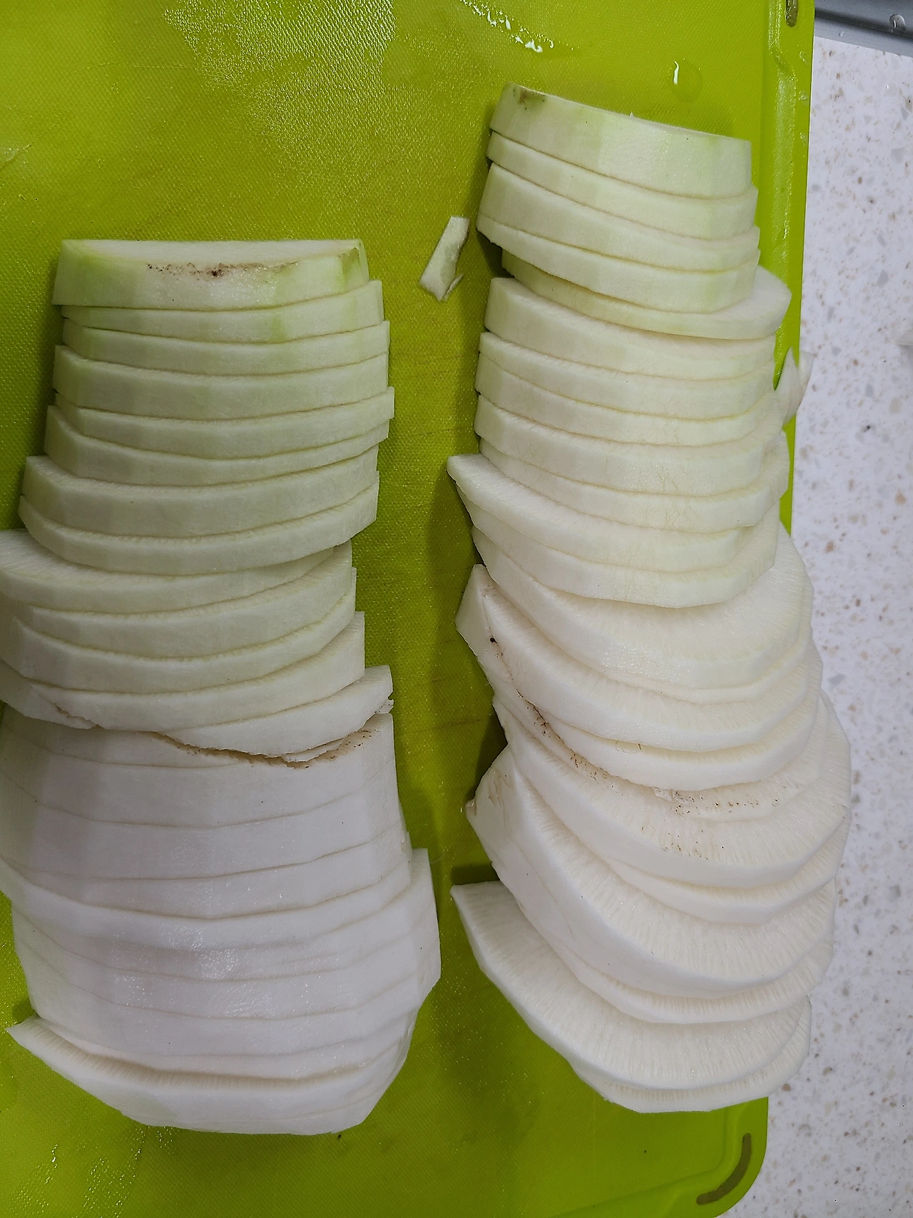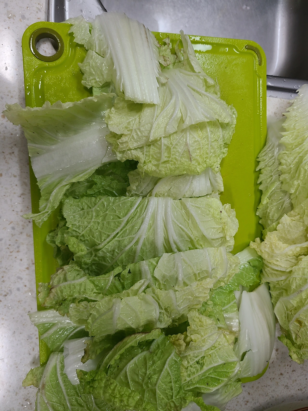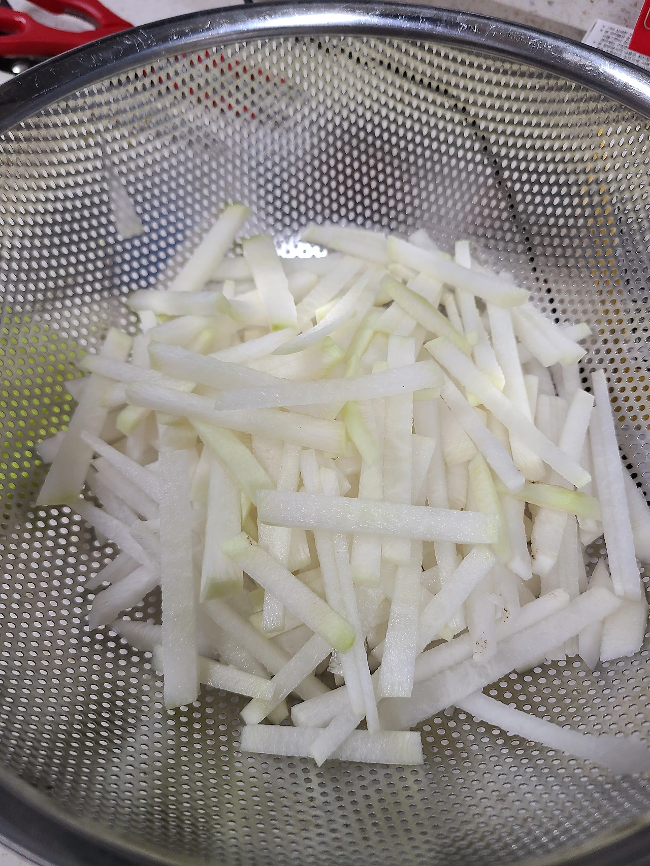운명의 장난인지 오늘따라 채칼이 보이지 않는다. 안전상의 문제로 애들 손이 닿지 않는 곳에 두긴 했는데 그곳이 어디었는지 통 기억이 나지 않는다. 어쩔 수 없이 그냥 어느 정도 간격 맞춰서 썰은 다음에 어슷 썰기로 최대한 얇고 길게 무를 썰고 배추도 알배추랑 이파리 부분을 구분해서 손질한다. 어차피 요리해도 아이들은 잘 안 먹고 어른들이 먹을 가능성이 높기에 적당한 크기와 모양을 갖추어 먹기로 한다.