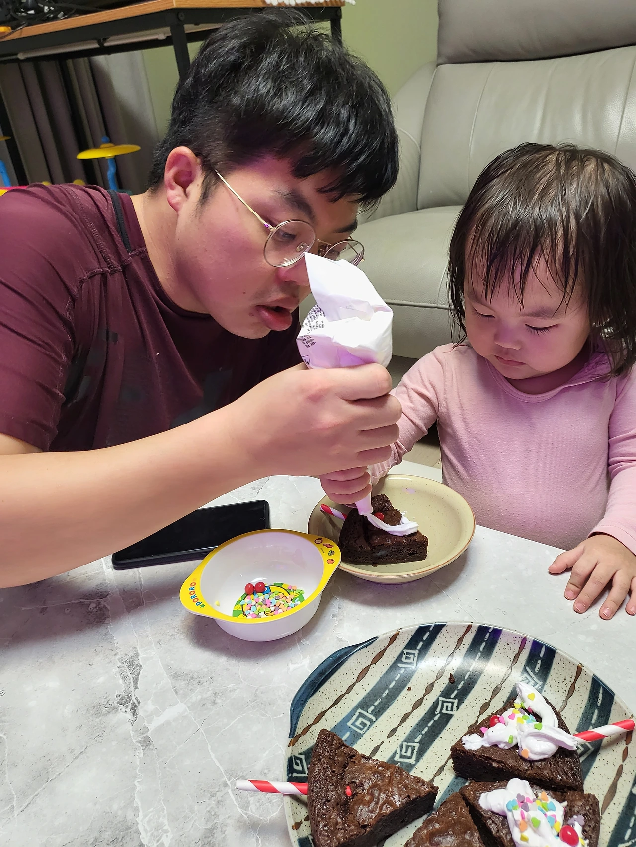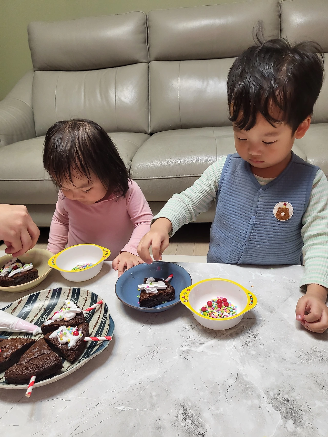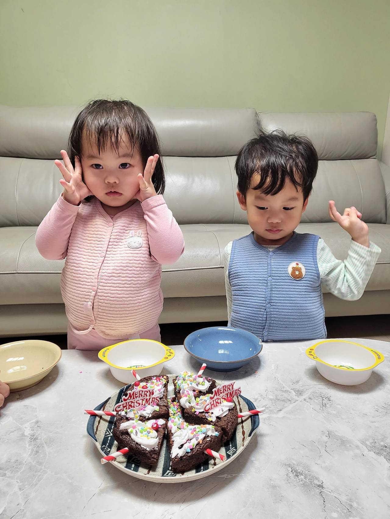 브라우니 밀키트는 우선 아가들의 관심을 사로잡기 에 충분했다. 왜냐하면 장식용으로 제공된 형형색색의 스프링클들이 무척이나 화려했기 때문이다. 브라우니 모양의 케이크 베이스에 생크림을 붓고 동봉된 스프링클을 개인 취향대로 뿌리니 제법 하나의 완성된 형태의 결과물이 나왔다. 그리고 각자 자기가 만든 케이크를 우유와 함께 곁들여 먹고 그렇게 아가들은 크리스마스 마지막 날을 마무리했다.
