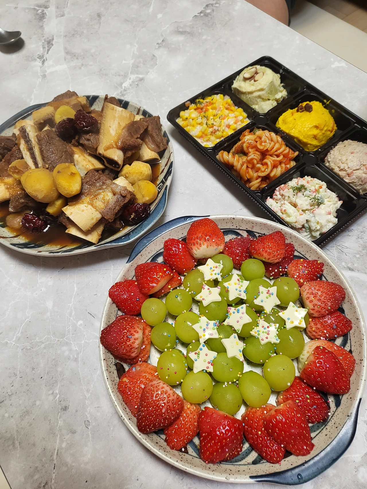 그리고 대망의 크리스마스. 오늘은 간단하게 크리스마스 음식을 만드는 활동을 해보기로 했다. 12월 초부터 '브라우니 만들기'를 계획해서 간단한 밀키트를 사 둔 것을 오늘에야 비로소 공개하는 날이었다. 그전에 배불리 저녁을 파티처럼 먹여야겠다는 생각에 와이프가 갈비찜을 준비했고 나는 간단히 샐러드와 과일로 크리스마스 분위기를 연출했다. 샐러드는 거의 먹지 않고 고기반찬으로 밥을 뚝딱 먹은 아가들. 그래 야채는 어린이집에서 많이 먹는다니까 그걸로 됐어.