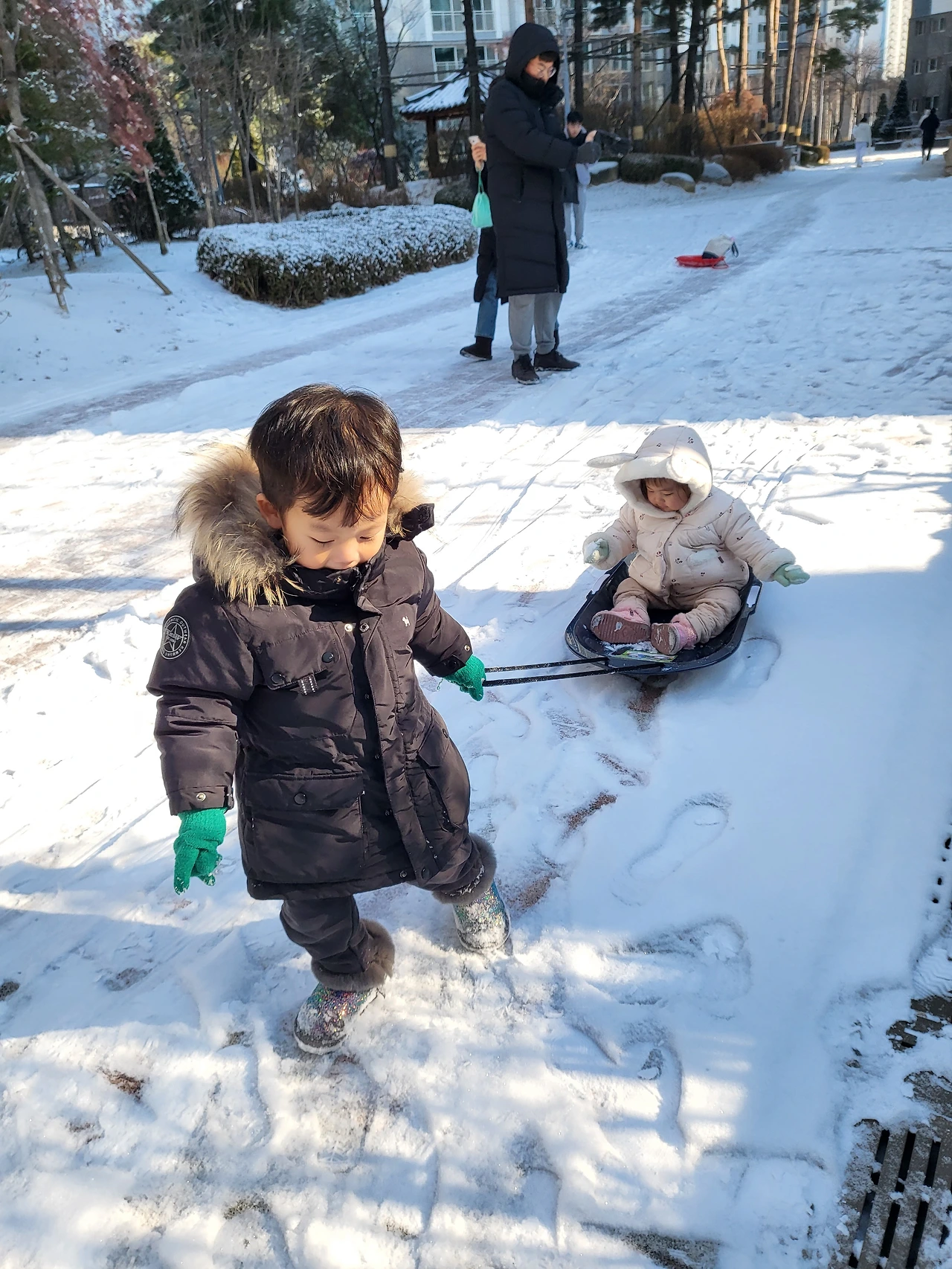그렇게 맞이한 크리스마스이브, 자고 일어나니 온 세상이 하얀 눈으로 뒤덮여 있는 것이 아닌가. 이른 아침부터 썰매 타는 아이들과 눈사람 만드는 가족들의 모습을 여기저기서 볼 수 있었다. 아침은 대충 먹는 둥 마는 둥 하며 부리나케 썰매를 싸 들고 아이들과 밖으로 나왔다. 작년에 지금보다 훨씬 어렸을 때도 썰매를 탔던 아이들이라 그런지 어떻게 몸을 움직여야 하는지 알고 있는 게 신기했다. 1년 새에 부쩍 커서 그런지 첫째는 제법 어린이의 티를 내며 둘째를 케어해 주는 모습이 인상적이었다.
