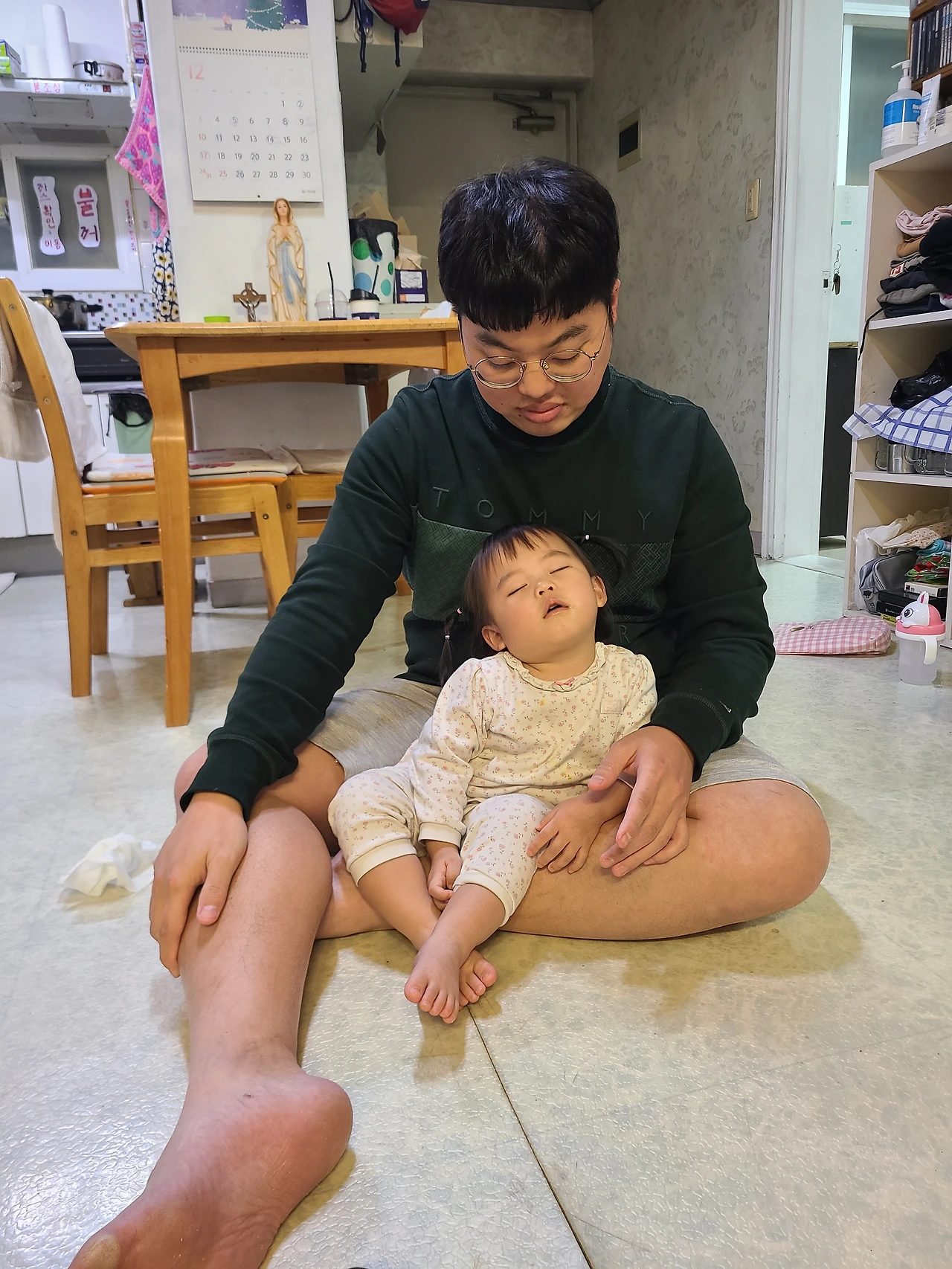 토요일 아침부터 컨디션이 좋지 않은 첫째는 엄마와 동네 인근에서 시간을 보내기로 하고 나는 둘째를 데리고 청아공원에 계시는 조상님께 인사를 드리러 갔다. 아빠와 단둘이 데이트를 하게 된 둘째는 모든 친척들의 관심과 시선을 즐기며 즐거운 시간을 보냈다. 특히 지난주부터 진정한 우리 식구가 된 고모부와 집게놀이, 가위바위보를 하며 30분을 꼬박 놀았던 것이 인상적이었다. 오랜만에 외동딸 놀이를 한 둘째는 그렇게 밤 11시가 될 때까지 할머니 집에서 저녁도 배불리 먹고 곤히 잠든 채로 집에 왔다.