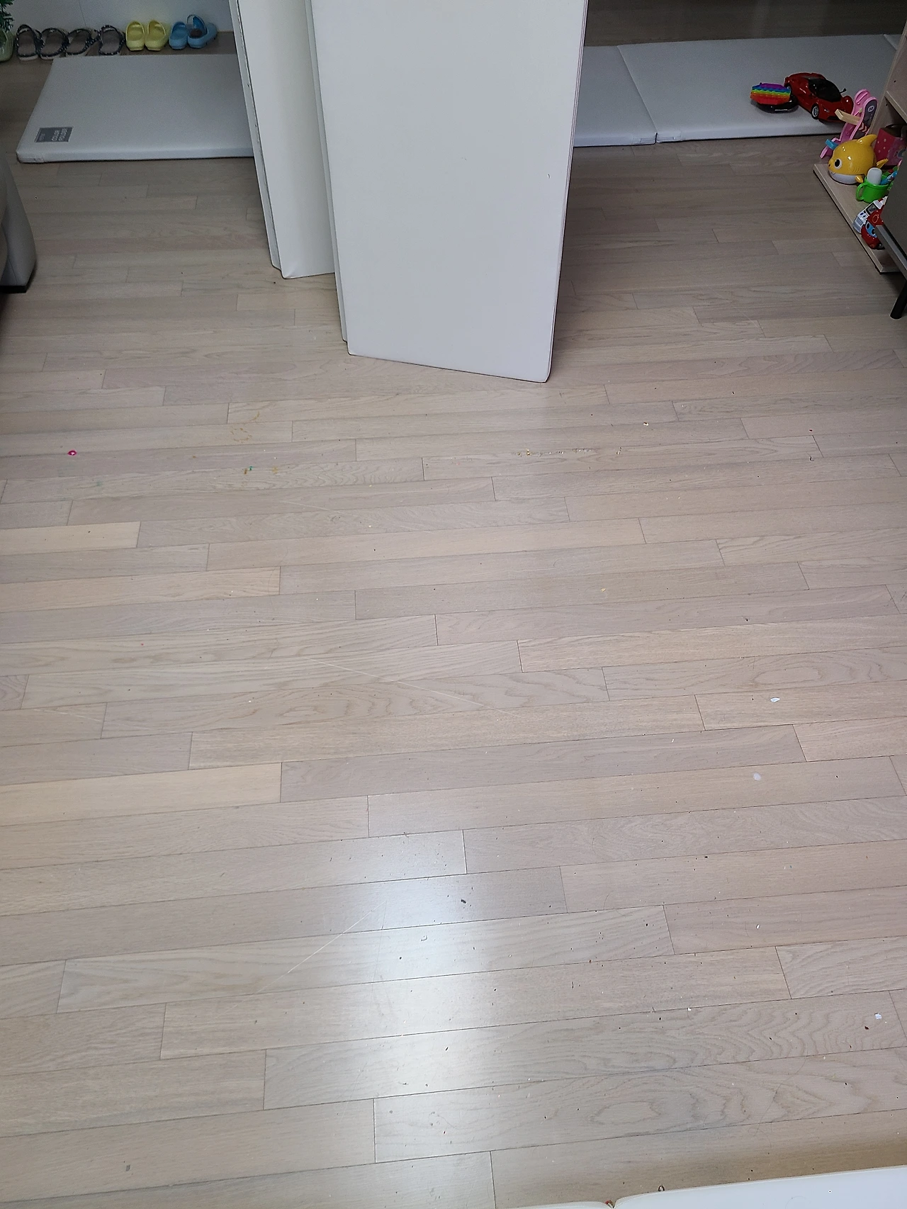 우선적으로 매트에 붙어있는 각종 잡동사니(?)들을 떼어내는 작업부터 하기로 했다. 그리고 인터넷을 통해 구매한 청소용 스프레이와 마른 수건, 물티슈를 활용해 매트 앞뒤는 물론 모서리까지 깨끗하게 닦아냈다. 생각보다 매트가 넓어 앉았다 일어났다를 계속 반복해서 작업하다 보니 환기차 창문을 열었는데도 불구하고 이마에 땀이 송골송골 맺혔다. 청소하다 보니 주로 아이들이 갖고 노는 클레이 부스러기들이 많이 나왔다. 매번 클레이의 잔해들을 나름 치웠다고 생각했는데 매트 구석구석에 덕지덕지 붙어있는 클레이들이 마치 나를 조롱하는 느낌이 들었다.