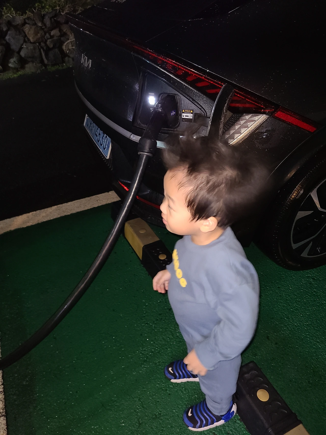 최근에 차에 상당한 관심이 많은 첫째는 요즘 아빠와 셀프주유소에서 기름을 넣는 것을 굉장히 재미있어하고 은근 자부심도 있는 눈치다. 그런 첫째의 눈에 기름을 넣는 차가 아닌 전기를 충전하는 형식의 자동차가 들어왔으니 호기심이 넘치는 것은 당연지사. 한밤중 주변이 제대로 보이지 않고 어두컴컴한 분위기에서도 전기차 충전은 꼭 자기가 아빠랑 함께 해야 한다는 아들의 성미를 누가 막을쏘냐. 씩씩하게 전기차 충전 코드를 꽂더니 이내 알 수 없는 두려움에 화들짝 아빠 품으로 달려와 안아달라는 모습에서 수십 년 전 내 모습이 보이는 듯했다. 시간이 가면 갈수록 아빠 어릴 때랑 닮아가는 아들의 모습이 마냥 신기하면서도 귀엽다.