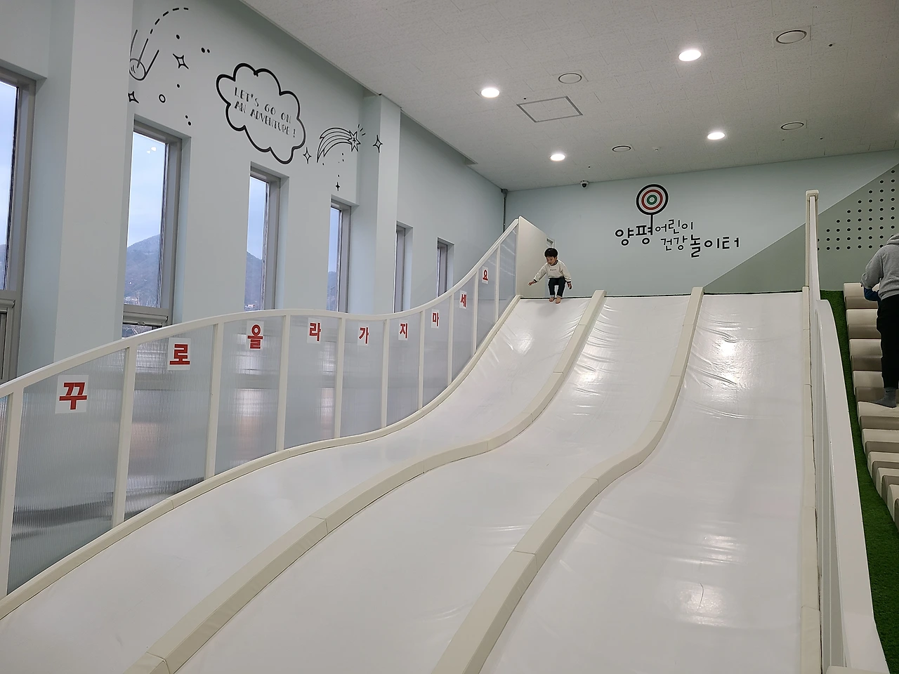 정식명칭이 '양평어린이건강놀이터'로 양평에서도 나름 중심지인 양평읍에 위치하고 있었다. 2시간 이용에 사전 예약이 필수인데 와이프의 기지로 당일 예약이라는 놀라운 선물을 받게 되었다. 보통 키즈카페를 다녀오면 입장료에만 4~5만 원 정도 소요되는데 4인 가족 도합 12,000원밖에 들지 않았다. 시설은 여느 키즈카페 못지않게 재미있는 기구들이 가득했고 지자체에서 관리해서 그런지 꽤나 쾌적하고 깔끔했다.