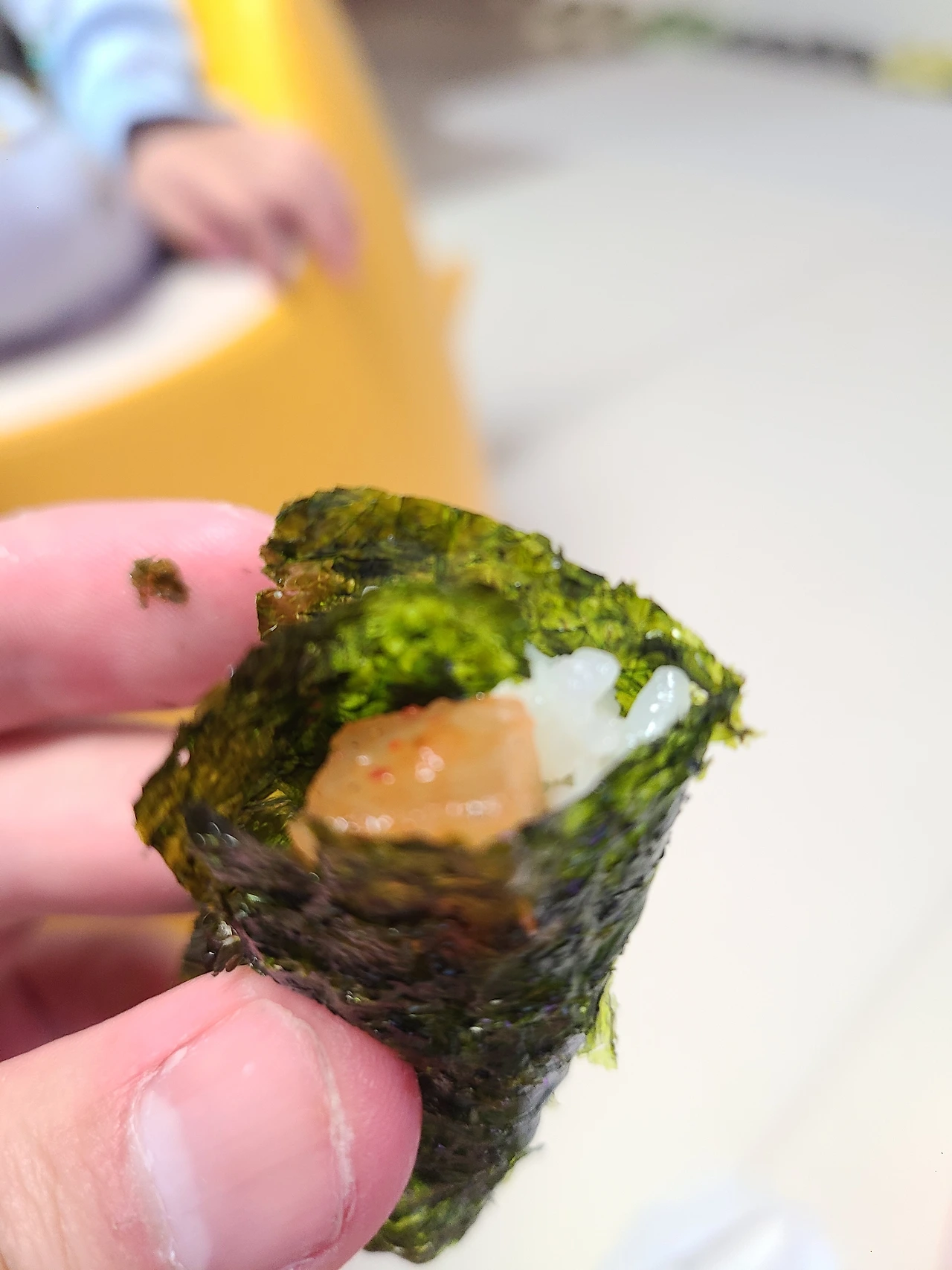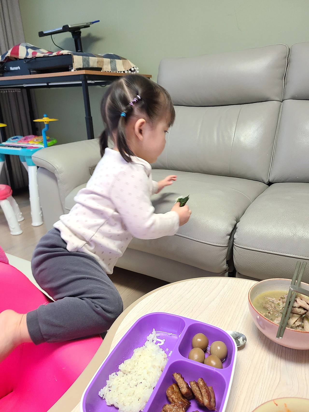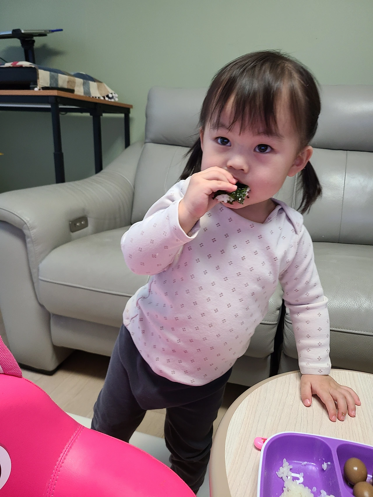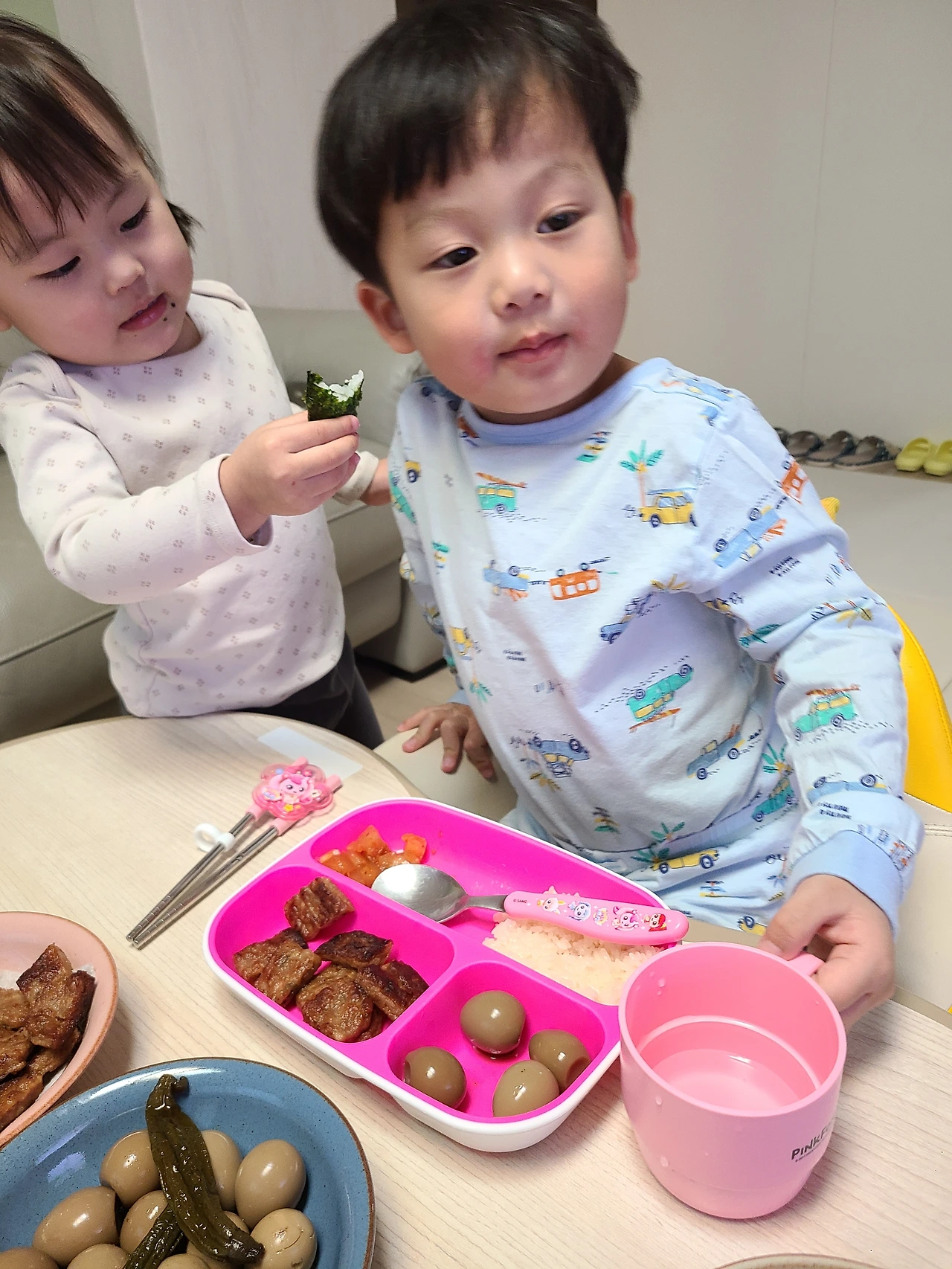 밥상머리 교육이 시대가 바뀌며 예전만 못하다 하지만 여전히 그 중요성은 강조되고 있는 것이 현실입니다. 아이들에게 엄격하거나 단호하진 않지만 어르고 달래서 가족끼리 식사시간을 준수하는 것을 늘 목표로 삼아 행하는 편이죠. 하아. 그런데 오늘은 정말 밥 먹이기가 쉽지 않았습니다. 결국 비장의 무기 '김'을 꺼내 밥을 돌돌 말아 하나씩 물렸더니 조금이라도 먹긴 하네요.
