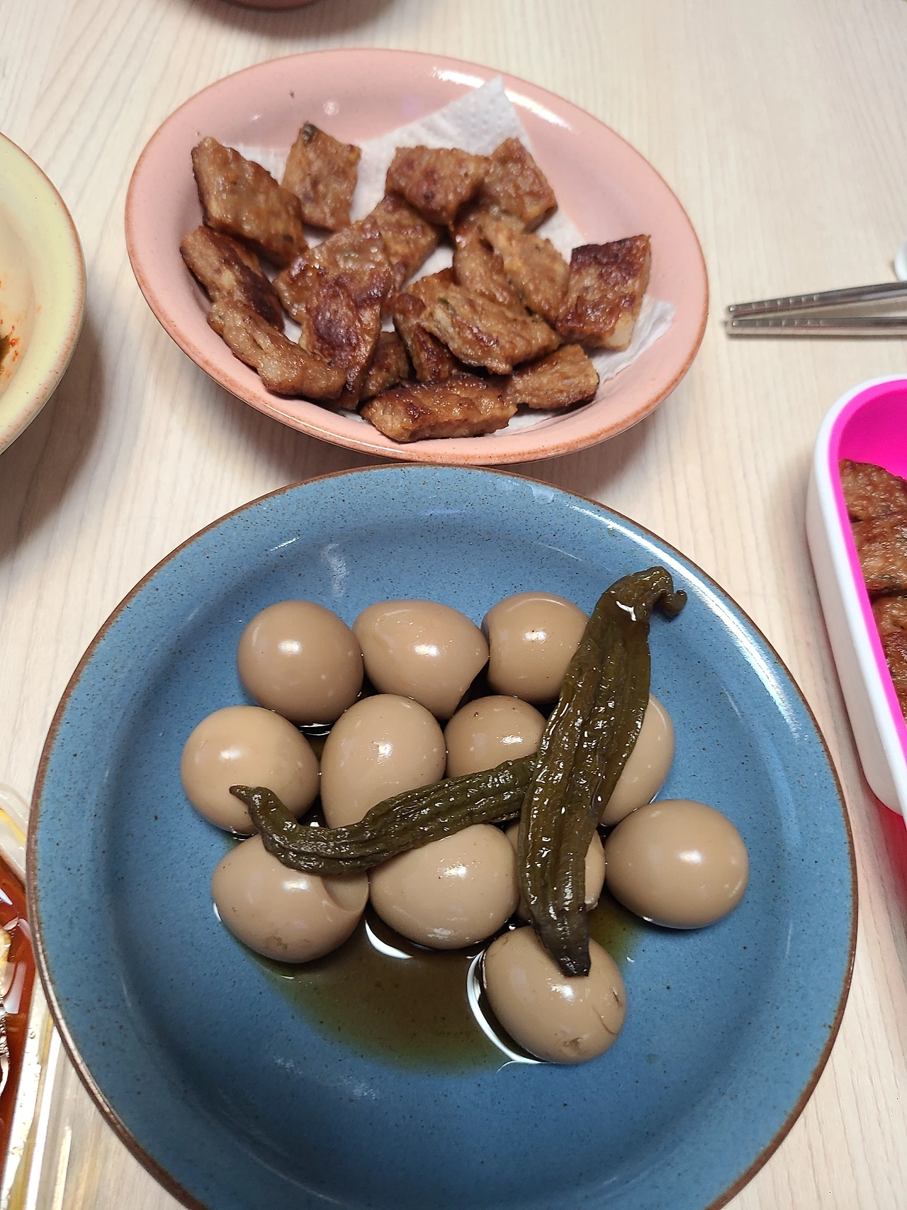 그럼에도 불구하고 아이들을 위해서 저녁상은 꼬박꼬박 차립니다. 맘 같아선 배달음식에 반찬배달까지 깡그리 해버리고 싶지만 저희 부부는 그렇지 못합니다. 특히 반찬 가게는 사 먹고도 만족했던 적이 그리 많지 않고 간단한 밑반찬 정도는 한두 번 먹을 정도만 그때그때 만들어먹는 게 훨씬 낫습니다. 그래서 오늘은 메추리알 장조림과 떡갈비를 준비해서 반찬으로 먹입니다. 첫째의 최애 반찬 깍두기도 곁들여서 말이죠.
