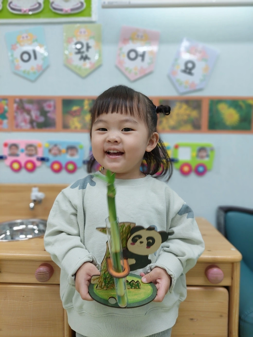 허니와 달콤이는 날씨가 좋은 날엔 야외에서 벚꽃을 보며 즐겁게 놀이하는 시간을 가졌습니다. 수도권 지역은 아마 이번 주말까지가 딱 벚꽃 시즌일 것 같은 모양새입니다. 일부 벚나무는 벌써부터 초록색 옷을 갈아입기 시작했으니 말이죠. 또한 식목일을 맞아 '개운죽 만들기' 행사도 진행했습니다. 아가들은 개운죽을 예쁘게 키울 수 있도록 각자 판다 모양의 받침대를 꾸며 왔는데 아무래도 자기 자신이 직접 만든 개운죽 꾸미기 세트라서 그런지 좀 더 관심 있게 개운죽을 키우려는 의지가 엿보입니다.
