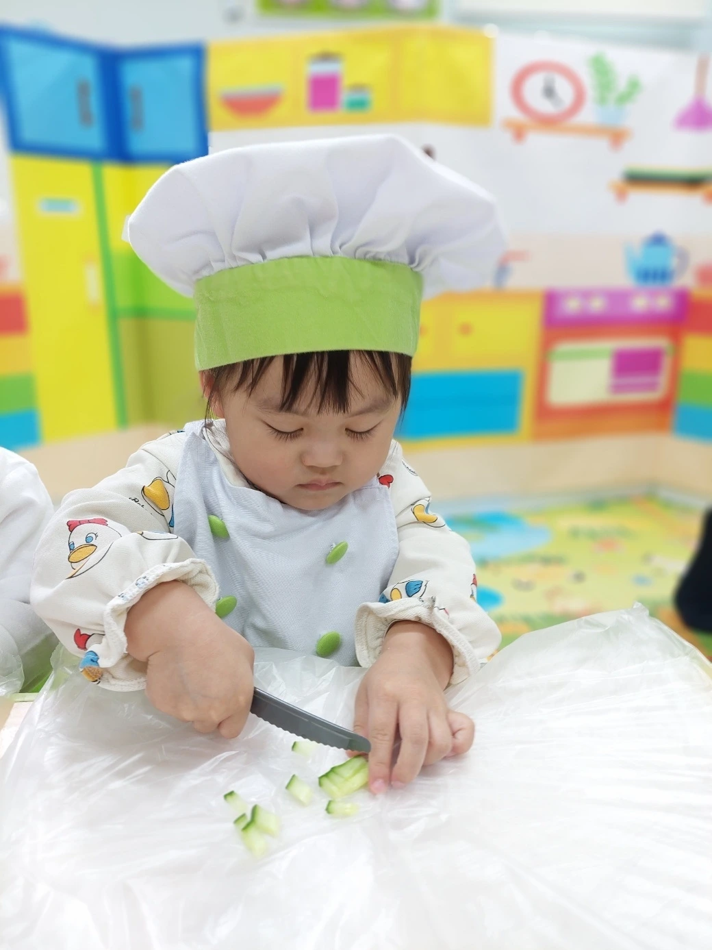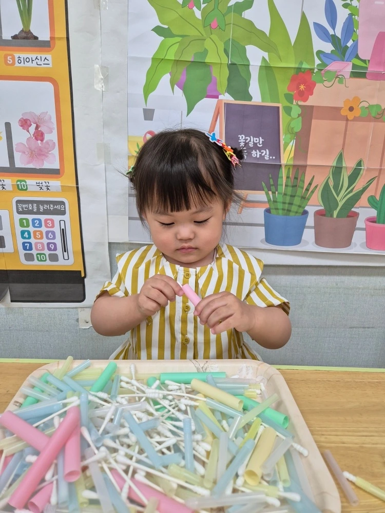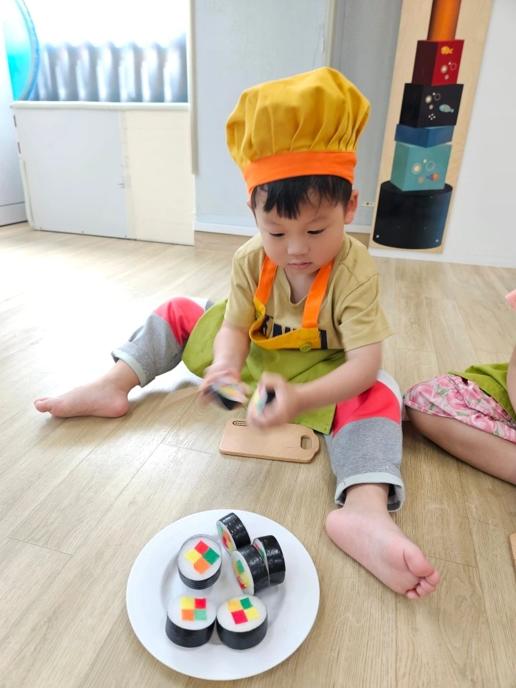 월요일에 만 1세 반 달콤이는 촉감놀이를 하고 만 3세 허니는 자유놀이를 하였습니다. 원체 작은 체구로 태어난 탓인지 소근육이 우선적으로 발달한 달콤이는 집중을 하며 작은 면봉을 구멍사이에 가득 채웠다고 합니다. 뜻대로 안 되면 물건을 던지는 버릇을 고쳐야겠다는 조언도 들었다고 하네요. 자유놀이시간에 허니는 컵 쌓기 놀이를 집중해서 했다고 합니다. '스피드스택스'라는 명칭으로 세계적으로 유명한 쌓기 놀이 게임인데 확실히 아들이라 그런지 체육 활동에 남다른 관심을 보이는 듯합니다. 다른 친구들이 코스튬을 갖춰 입고 역할놀이에 빠져있을 때에도 허니는 끝까지 컵 쌓기 놀이를 즐겼다고 하네요. 또한 허니와 달콤이 모두 음식 만들기 수업을 진행했는데 채소를 잘 먹지 않는 아이들임에도 불구하고 자기가 만든 샐러드를 남김없이 모두 먹었다고 합니다. 아무래도 본인이 만들었다는 데에서 오는 소중함과 자부심이 덧붙여졌기에 일어난 결과라고 생각합니다.