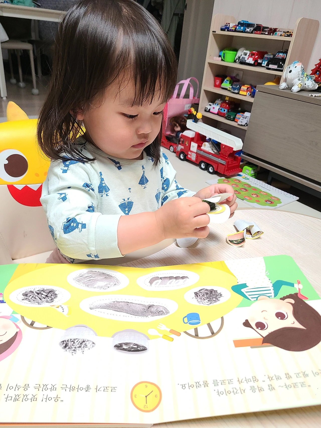 그리고 허니와 달콤이 모두 4월 한 달 자신들이 배운 교과서와 이야기책, 교구들을 집으로 가지고 왔습니다. 만 3세인 허니는 '누리나래'라고 불리는 교육과정 속 한글책, 영어책, 수 세기 책을 가지고 왔고 만 1세인 달콤이는 그동안 수업시간에 끼적이기 한 것과 붙임 딱지를 붙인 것들을 가지고 왔습니다. 딱히 복습이라는 개념을 갖고 접근하진 않지만 아이들이 배운 책과 교구들을 부모와 함께 집에서 살펴보는 활동은 생각보다 의미 있는 경험이라고 생각합니다. 아이들이 자기가 배운 내용을 자신의 언어로 다시 한번 살펴보고 표현하는 이른바 '메타인지'가 가능해지는 순간이기 때문이죠. 그럴 때마다 덧붙이는 칭찬 한 마디는 아이들의 어깨를 한층 으쓱하게 하더군요. 이젠 그게 확실히 느껴지는 때인 듯합니다.