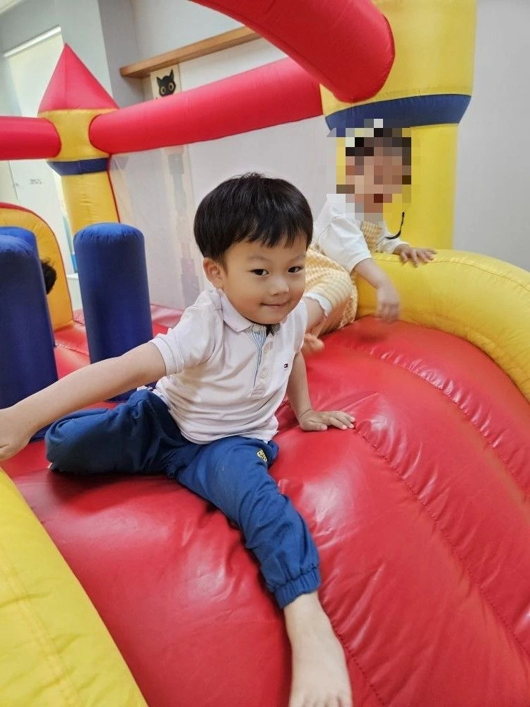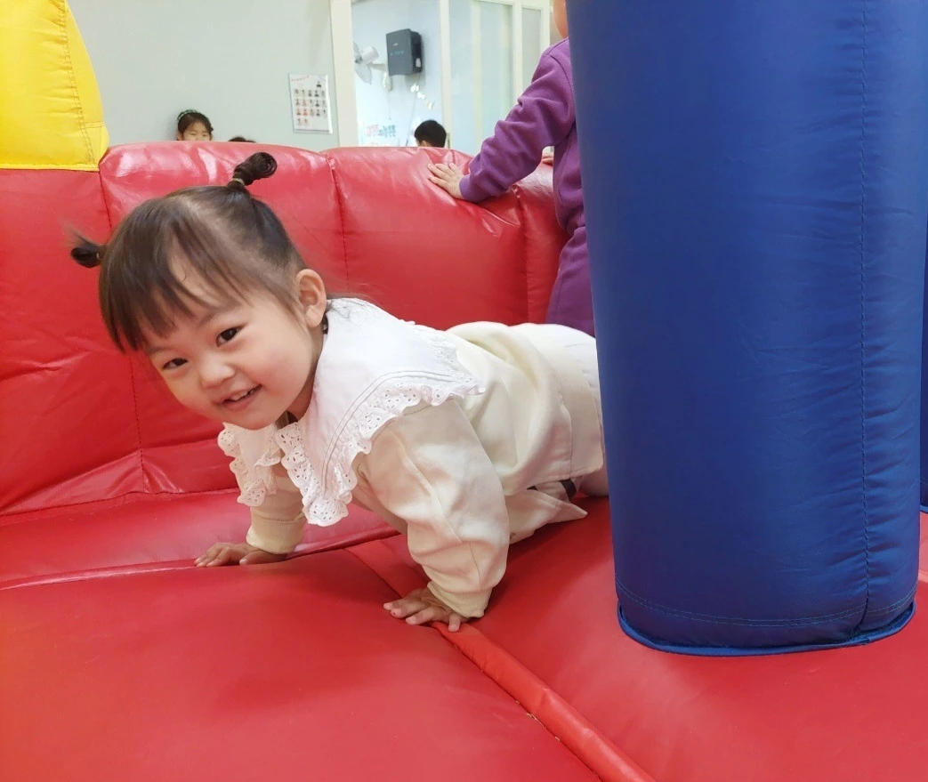 목요일은 특성화 프로그램으로 '에어바운스 체험'을 하였습니다. 어린이집 다목적실에 커다란 에어바운스가 설치되었고 허니와 달콤이는 익숙한 듯 재미있게 즐겼다고 합니다. 사실 우리 아이들은 첫돌이 되기 전부터 키즈카페를 경험한 경력자(?)이기 때문에 전혀 스스럼없이 놀이에 참여할 수 있었습니다. 만 1세인 달콤이의 친구들 중 일부는 에어바운스를 보고 다소 두려움을 느꼈다고 하네요. 그 아이들도 오늘을 계기로 두려움을 잊고 앞으로 어느 키즈카페를 가도 잘 즐길 수 있는 발판을 마련한 하루가 되었으리라 생각합니다.