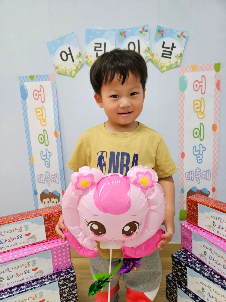 그리고 5월 첫째 주 마지막날, 어린이날을 맞아 허니와 달콤이들은 기념사진을 찍고 선물을 받으며 즐거운 시간을 보냈습니다. 특히 아이들에게 요즘 최고로 인기가 많은 티니핑 캐릭터 중 '하츄핑' 풍선을 받으며 기뻐하는 모습이 인상적입니다. 조리사 선생님이 특별히 신경 써서 만들어주신 수제치킨을 배불리 먹고 오후 시간 체육까지 재미있게 즐기다 온 아이들에게서 어린이날의 소중함을 다시금 느낍니다.