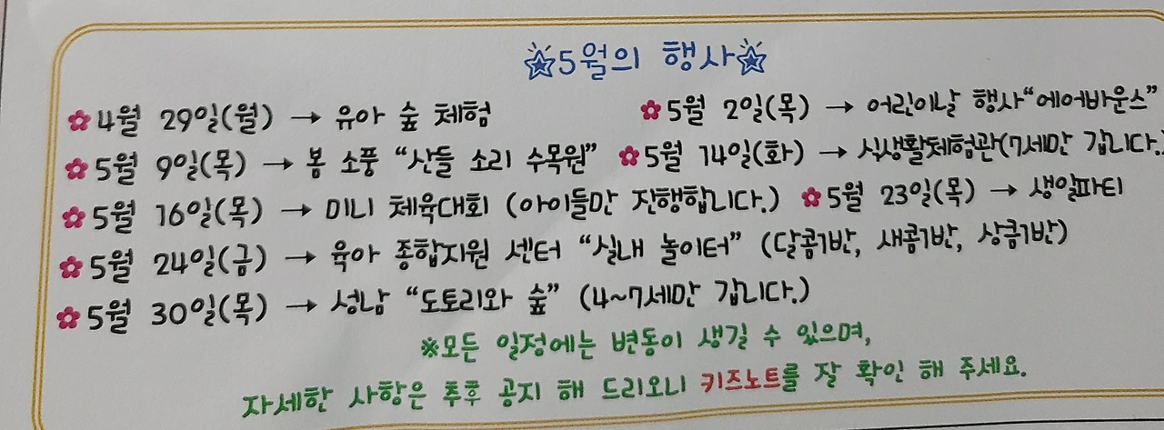 어린이집에서 보내준 5월 가정통신문을 보니 유난히도 깨알 같은 글씨가 빼곡하게 적혀있습니다. 5월 한 달 동안 어린이집에서 하게 될 교육행사가 너무 많아 가정통신문 1장에 미처 들어가지 못할 정도더군요. 가정의 달 5월을 맞아 가정에서도 아이들과 즐거운 추억을 만들듯이 어린이집에서도 5월을 제대로 보내기 위한 만반의 준비를 하고 있는 느낌입니다. 허니와 달콤이가 그만큼 즐겁게 어린이집 생활을 할 것이라는 이야기지요.