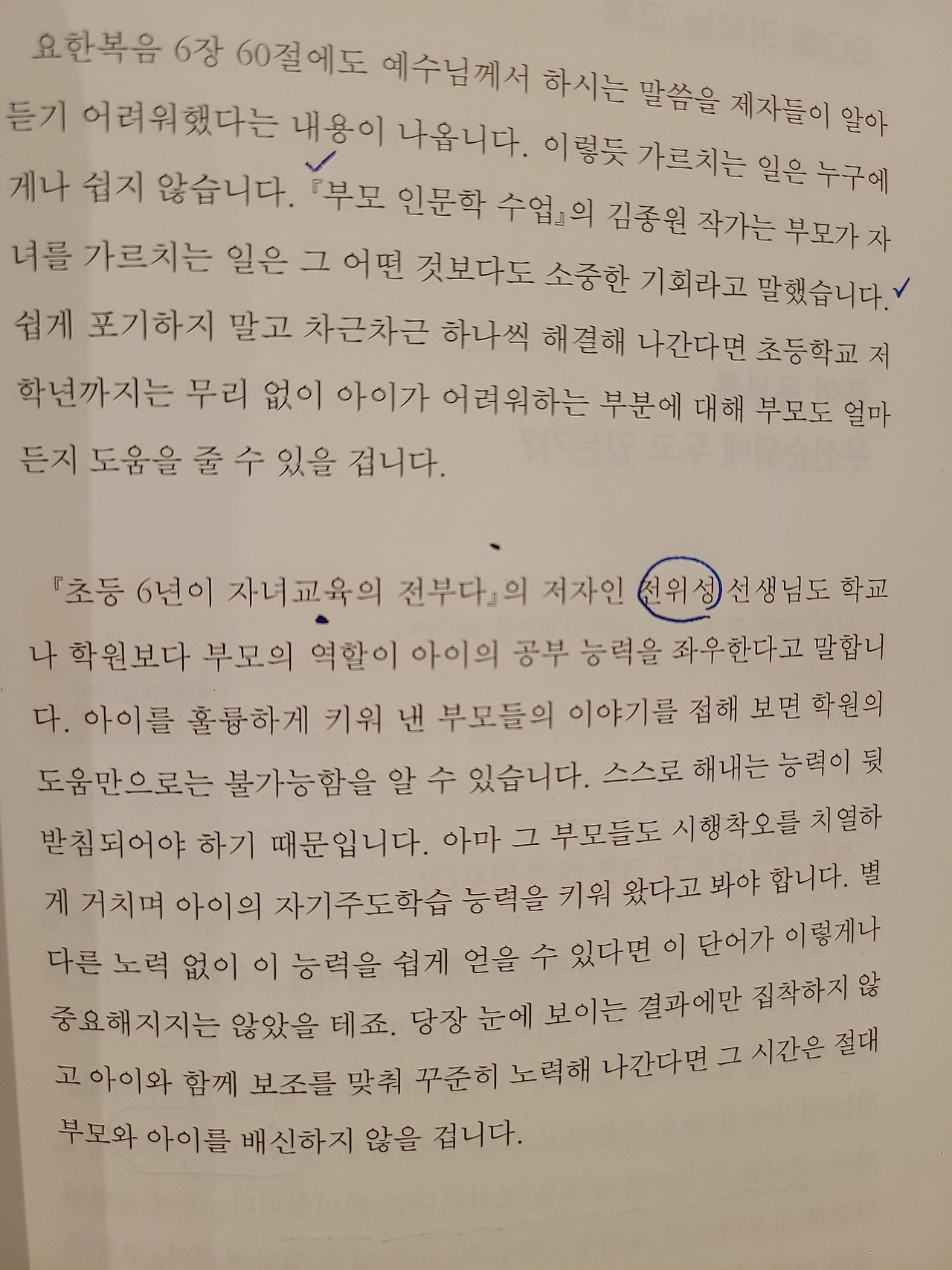 글을 읽으면 읽을수록 작가가 아이들을 올바른 존재로 기르는 데 얼마나 많은 노력을 기울였는지에 대해 감탄하게 됩니다. 때로는 수십 권을 넘게 읽었던 교육 저서를 인용하기도 하고, 세계적인 인문학, 교육학 석학들의 명언을 꺼내놓기도 합니다. '채근담'과 '격몽요결'을 통해 인격 수양에 필요한 덕목을 제시하기도 하고, 니체, 비트겐슈타인들을 일컬으며 '배움'의 근원을 언급하기도 하죠. 이따금씩 오타니도 등장하고, '마당을 나온 암탉' 애니메이션도 등장합니다. 그러다 보니 글을 읽으며 덤으로 얻게 되는 '알쓸신잡'을 하나둘씩 쌓아두는 재미도 있습니다. 4년 내내 교육학을 전공했고 교육심리학, 교육 철학에 관해선 보통 사람들에 비해 조금 더 알고 있다 생각했던 스스로를 반성하는 순간이기도 했고요.