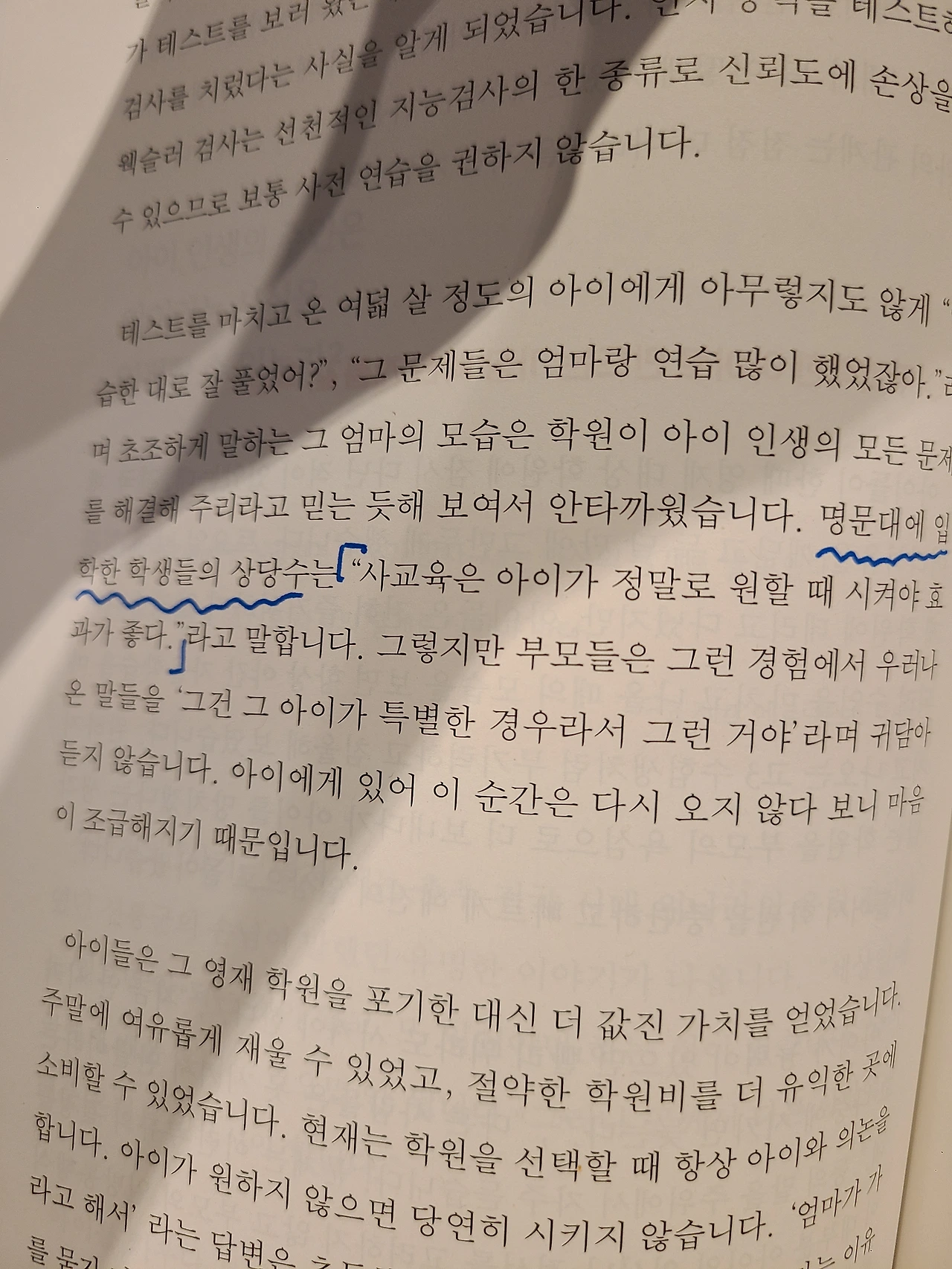 개인적으로 가수 진성의 명곡 '태클을 걸지 마'라는 곡이 담고 있는 의미를 좋아합니다. 나도 너에게 태클을 거는 삶을 살지 않을 테니 너도 함부로 나에게 감 놔라 배 놔라 하지 말라는 의미이죠. 희한하게도 이러한 가치관을 육아에 도입하는 순간 제대로 지켜지지 않을 때가 상당히 많습니다. 엄마아빠가 시키는 대로 하기를 종용하고 한 시대를 한번 겪어왔다는 걸 빌미로 잔소리를 늘어놓는 경우가 있죠. 대부분의 자녀문제와 갈등의 원인은 이와 별반 다르지 않을 겁니다. 작가는 이러니 저러니 해도 결국 그 해답은 '부모'에게 있다고 말합니다. 한마디로 '콩 심은 데에서 콩 나지 팥이 나겠느냐.' , '아니 땐 굴뚝에 연기 나겠느냐'는 겁니다. 수백 수천 사교육비보다 진심을 담은 부모의 따뜻한 말 한마디가 더 소중하고 언제든지 감사하고 사과할 줄 아는 태도가 의대 입시보다 중요하는 것을 말이죠. 그렇게 한 걸음씩 아이들이 삶의 방식을 나름대로 마련하고 발돋움할 수 있도록 하는 것. 그것이 바로 올바른 부모가 되는 첫걸음이라 생각해 봅니다.
