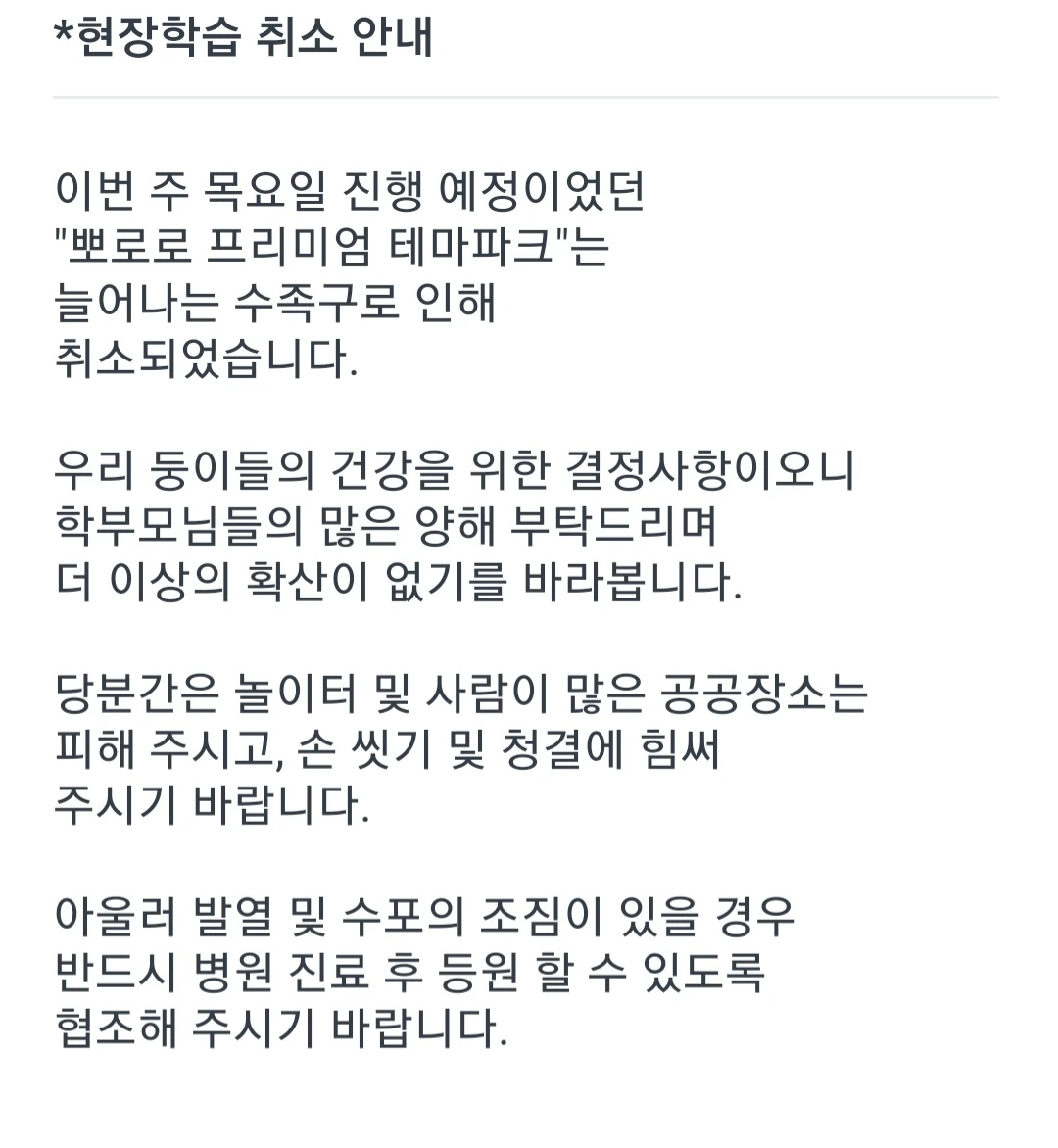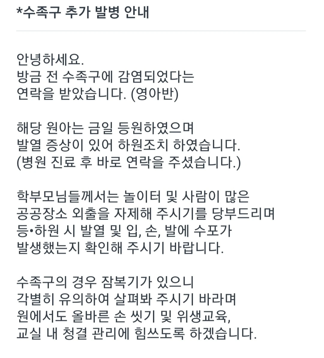 혹시라도 우리 달콤이가 수족구 증상이 발현된다면 언제든지 반차를 쓰든, 가족 돌봄 휴가를 쓰든지 해서 케어할 마음의 준비를 단단히 하고 있었습니다. 그런데 이게 웬걸. 10명 중 2명만 등원하게 된 이 상황을 오히려 즐기는 듯한 달콤이의 모습이었습니다. 친구들이 아무도 없으니 담임선생님의 사랑을 독차지하게 된 것을 굉장히 기쁘게 생각하는 듯했습니다. 덕분에 담임선생님과 더 많이 산책도 하고 이야기도 나누었다는군요. 그렇게 좋아하는 키즈카페가 취소되었음에도 아랑곳하지 않고 어린이집 생활을 만끽하는 달콤이의 모습을 보면서 안도의 한숨과 미안함이 공존했습니다. 내가 일을 하지 않았다면 수족구 걱정은 더욱더 안 해도 되었을 텐데.