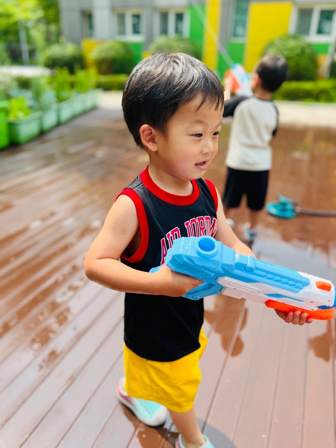 그리고 마침내 금요일, 허니는 친구들과 함께 체육선생님이 선사한 '물총놀이' 시간을 원 없이 즐겼답니다. 열대성 스콜이 발발하는 등 날씨가 오락가락한 탓에 낮이고 밤이고 항상 습한 기운을 머금을 수밖에 없는 요즈음에 안성맞춤인 활동이었다고 생각합니다. 허니는 처음에는 옷이 젖을까봐 쭈뼛한 모습을 보여주기도 했었다는데요. 결국 옷이 다 젖어버리자 '에라 모르겠다'라는 심정으로 적극적으로 물놀이를 했다는 후문이 전해졌네요. 그래서인지 집에 와서 5시부터 내리 3시간을 꿀잠을 자더니 자정이 다 되어서야 밤잠에 들었다는 믿고 싶지 않은 (?) 일화도 제공했답니다.