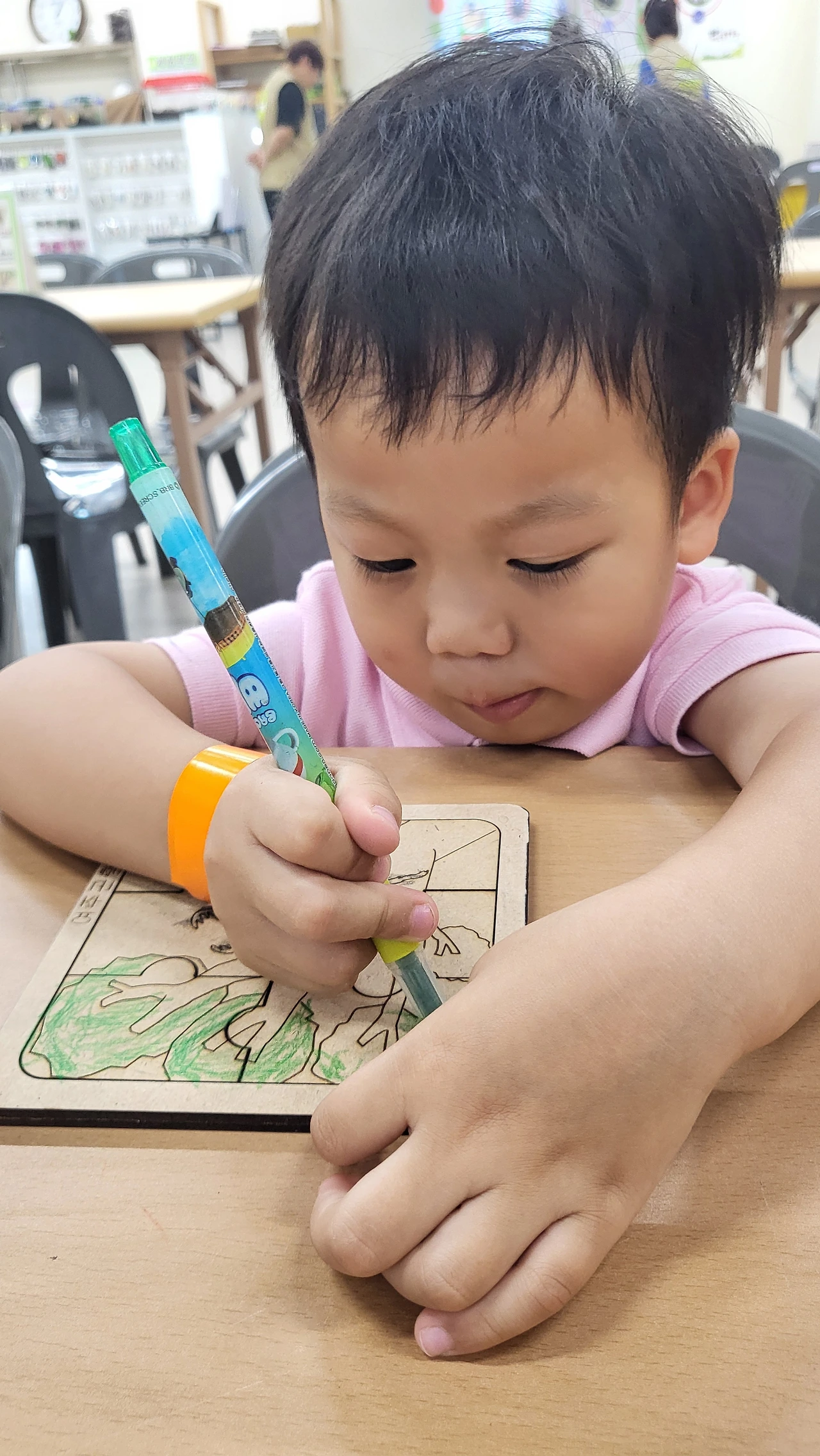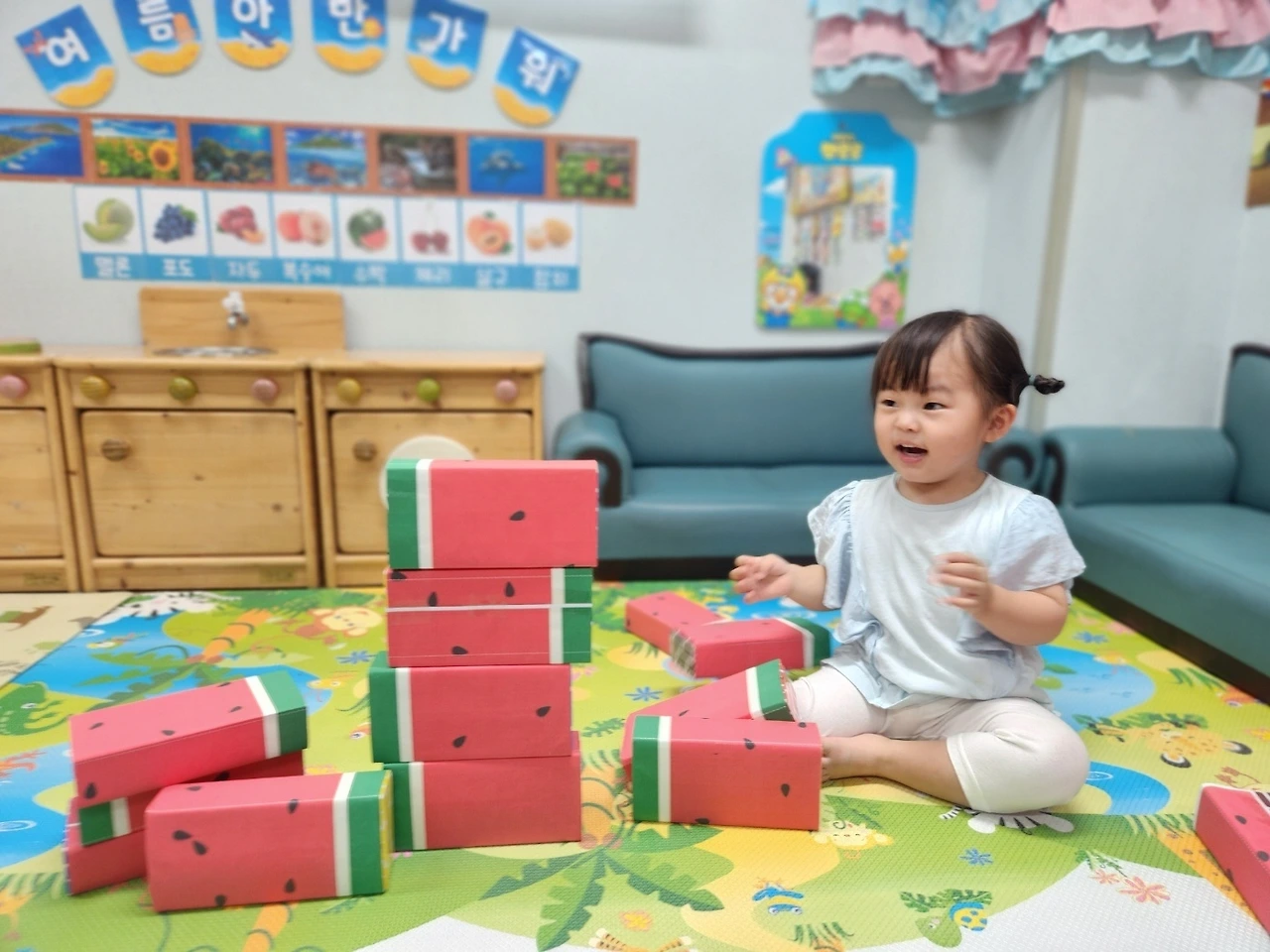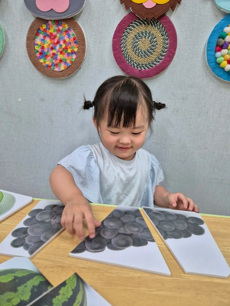 늘 어린이집이 신나고 재미있는 만 1세 달콤이는 오늘도 여름 과일과 채소를 가지고 꾸미기와 만들기를 하는데 여념이 없습니다. 포도 퍼즐을 모양에 맞추어 완성하기도 하고, 수박 모양의 놀잇감을 원하는 모양과 높이로 쌓기 놀이를 하면서 시간을 보냈네요. 자신이 원하는 높이까지 쌓으면 곧바로 무너뜨리고 다시 쌓기를 반복하는 모습이 재미있습니다. 오감활동 시간에 휴지심을 가지고 망원경처럼 눈에 대보고 색칠하여 쌓기 놀이를 하는 활동도 병행하며 즐거워했다는군요.