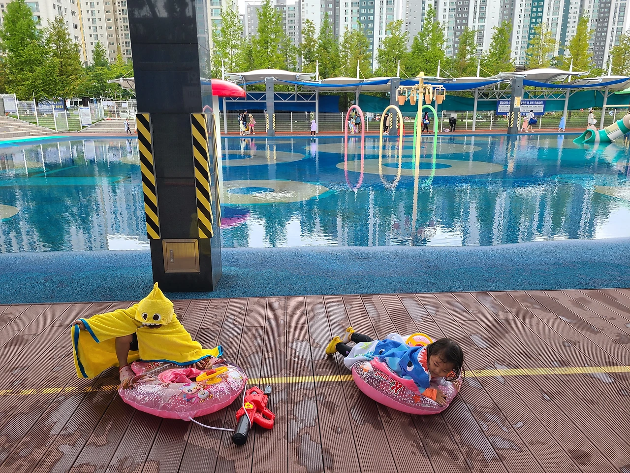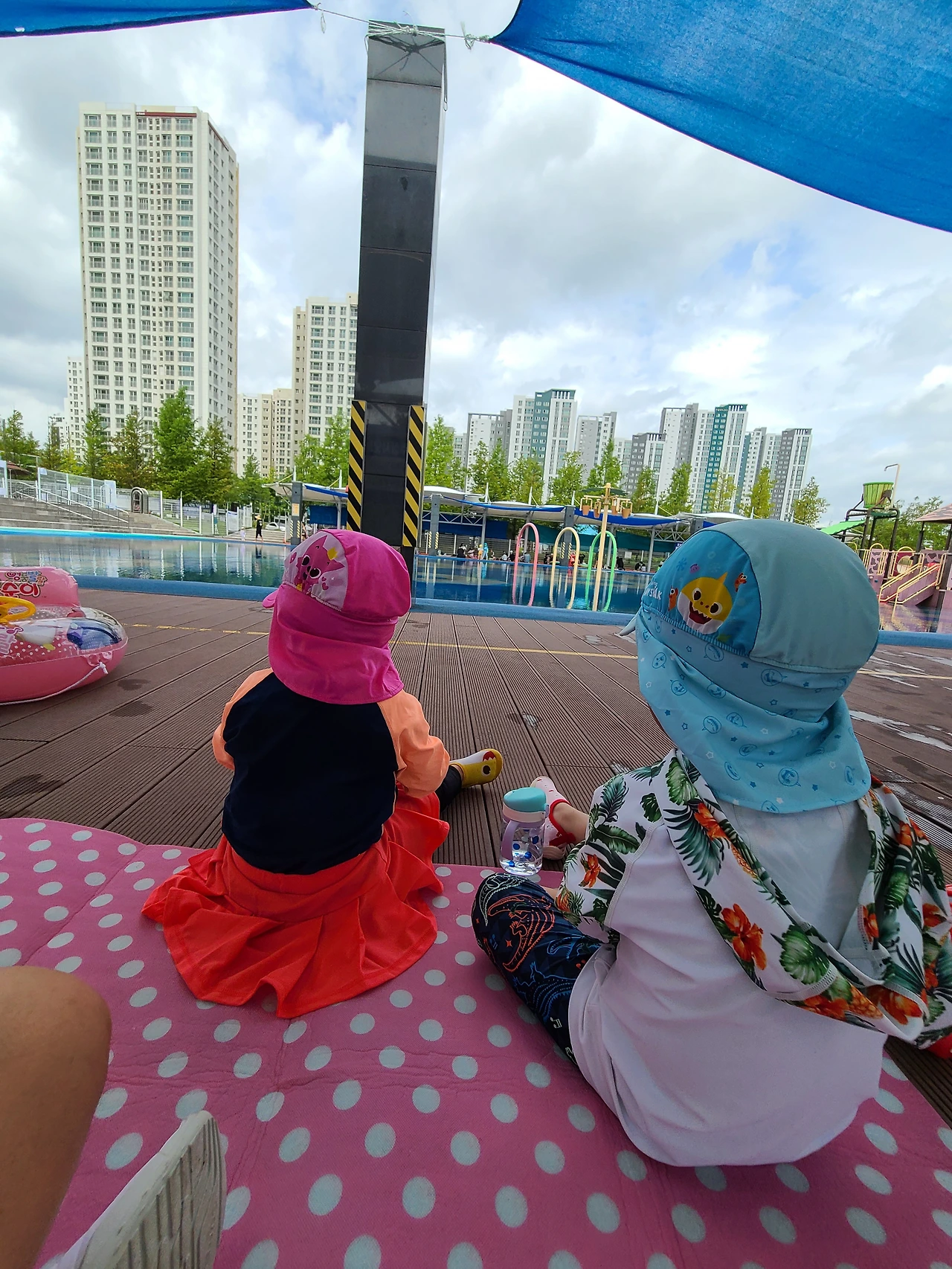 여름을 맞아 동네 수영장이 속속들이 개장하기 시작했기에 제일 가까운 수영장에 예약을 해서 방문했습니다. 아시는 분들은 아시겠지만 물놀이 한 번 가기 위해 두 아이를 위한 준비물은 그 종류도, 부피도 상당합니다. 큰 쇼핑백과 운동 가방 한가득 준비물을 바리바리 싸들고 놀다 보면 1~2시간이 금방 지나가고 뒷마무리는 그보다 곱절이 걸리죠. 그래도 아이들이 잠시나마 무더위를 피해 좋아하는 물놀이를 마음껏 즐기도록 할 수 있어 좋았습니다.