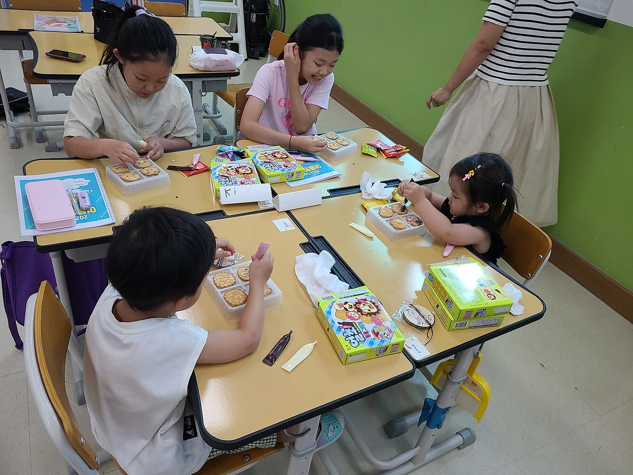 그리고 영어 캠프의 하이라이트는 허니와 달콤이의 깜짝 방문이었습니다. 아가들도 함께 할 수 있는 쿠키 만들기 세트를 준비해 학생들의 도움을 받아 작품을 완성하도록 했습니다. 특히 여학생들이 우리 아가들의 방문을 격하게(?) 환영해 주었고 성공적으로 수업을 마무리 지을 수 있었습니다.