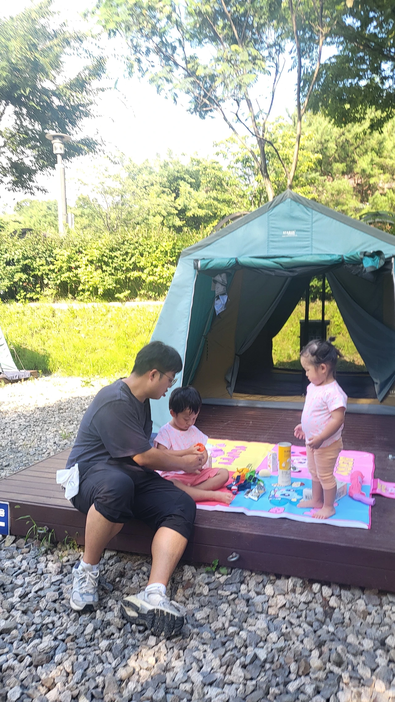 집에서 차로 15분 거리에 인기가 아주 많은 가족단위 캠핑장이 있습니다. 33,000원을 내면 타프가 설치된 텐트를 이용할 수 있고 캠핑장 주변에 유아 숲체험장도 있기 때문이지요. 그래서 예약일을 확보하기가 하늘에 별따기인데 때마침 취소 자리가 있어 와이프가 잽싸게 예약을 해 다녀올 수 있었습니다. 폭염경보가 내려진지라 해가 진 후에도 땀으로 샤워한 기분이었고 무엇보다 아가들의 성화가 대단했습니다.