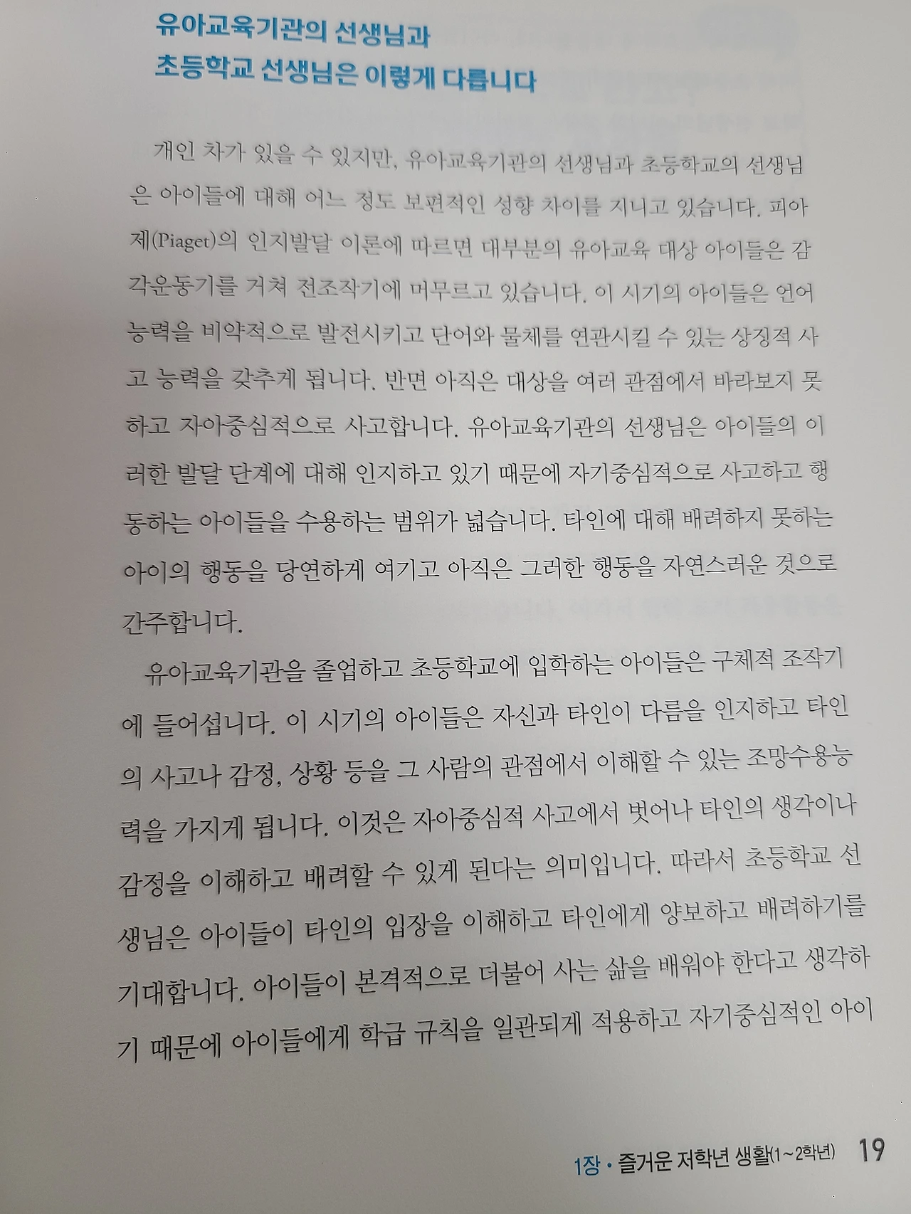 5살, 3살 육아를 병행하고 있는 육아대디의 입장에서 인상 깊었던 점은 유아교육기관과 초등학교의 성격이 분명하게 다르다는 것을 언급하는 부분이었다. 아이를 키우기 전에 느꼈던 생각은 '왜 이렇게 초등학교에 요구하는 부분이 유치원스러울까?'였다. 그런데 아이를 직접 키워보니 교육기관에 대한 확실한 경험과 견해의 차이가 존재했고 그것을 깨닫는 데에 구체적인 설명이 필요하다는 것을 알게 되었다. 엄연히 초등학교는 '교육기관'이고 어린이집과 유치원은 '보육기관'이라는 것. 낮잠 시간이 있고 오전 간식과 오후 간식이 존재하던 곳에서 자신만의 교과서와 책걸상이 있는 곳은 분명히 그 성격과 목적이 다르기에 운영 체계와 방식이 다르다는 것. 그것을 분명하고 정확하게 캐치하여 설명했기에 학부모의 입장에서 '아, 초등학교는 유치원, 어린이집과 이런 점이 확실하게 다르구나. 잘 살펴보고 적응시켜야겠다.'라는 생각을 하게 해 준다.
