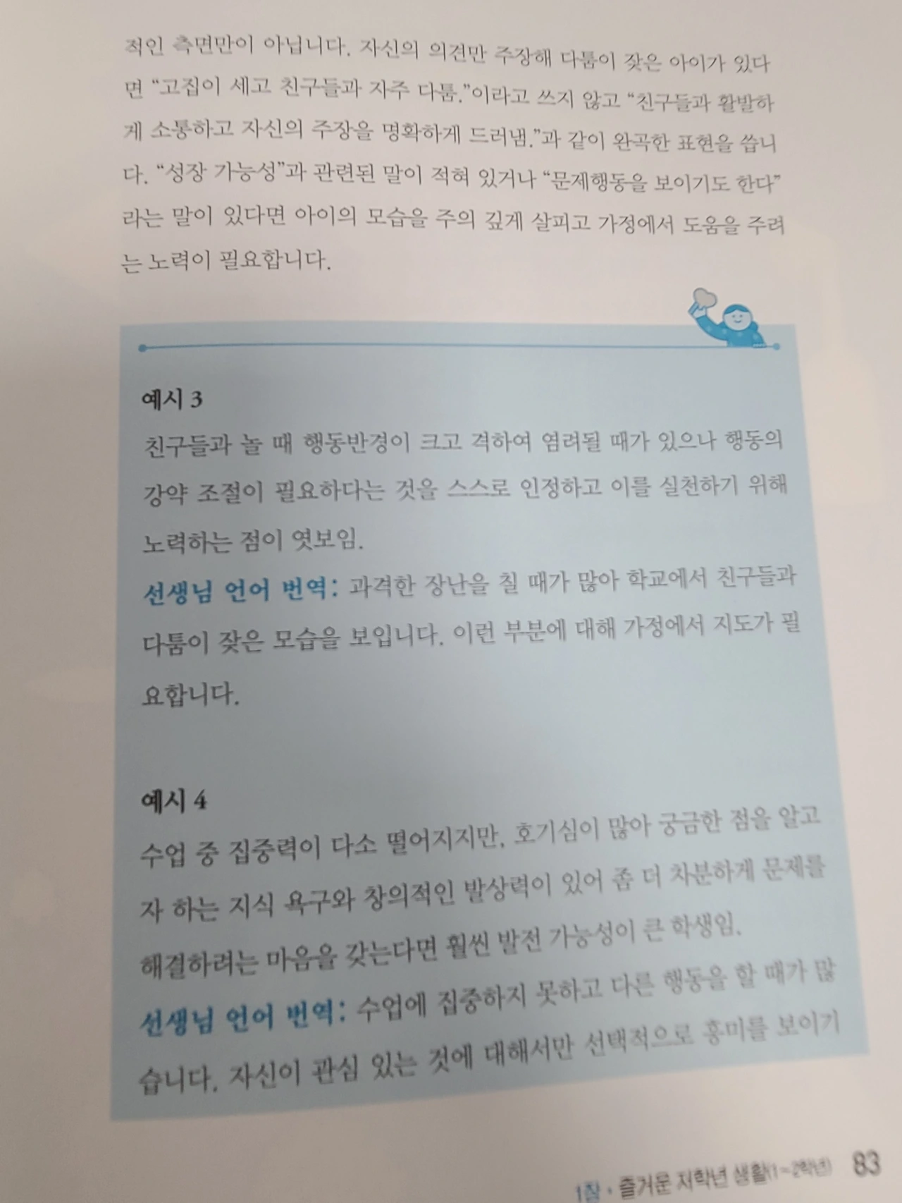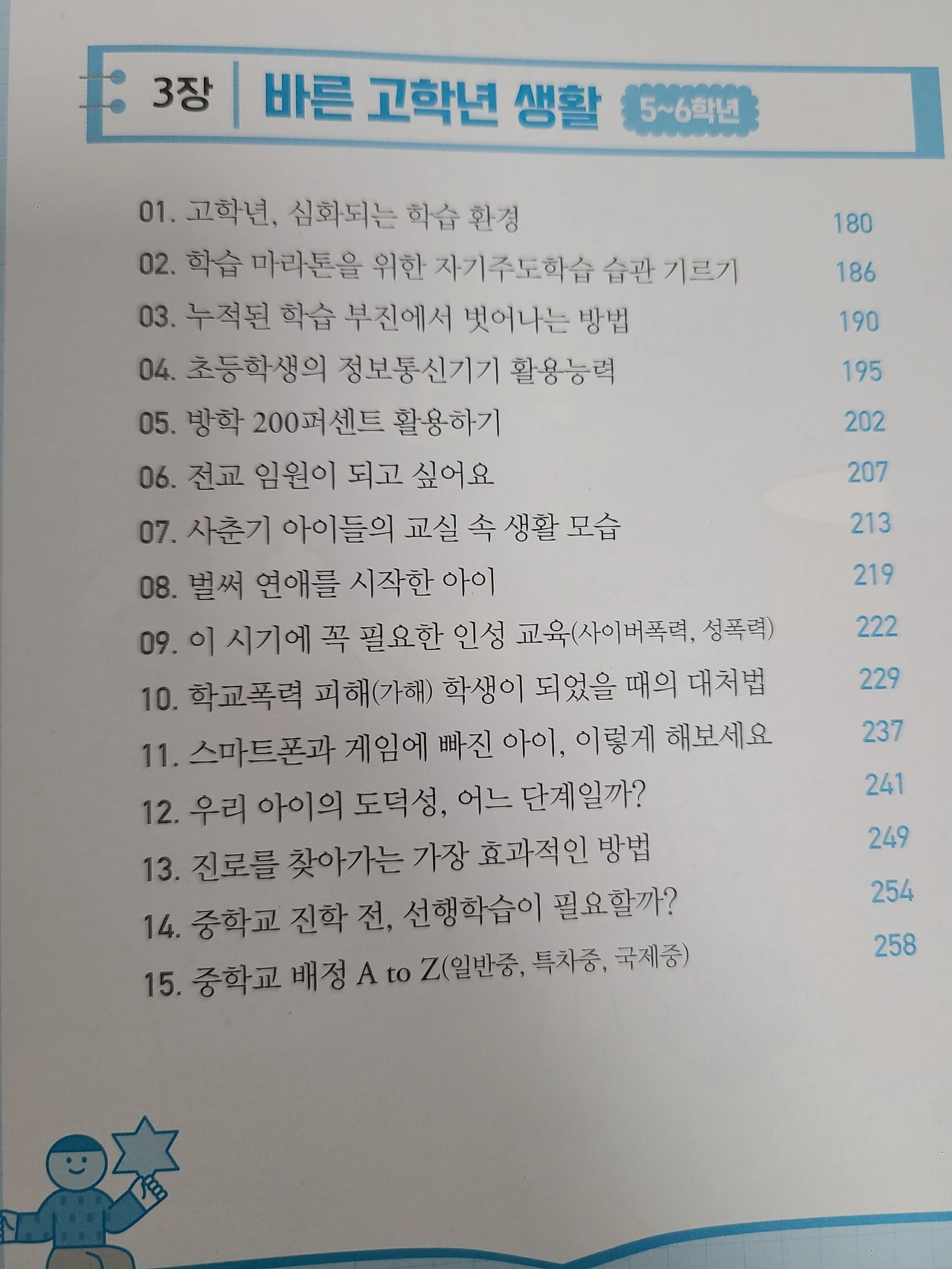 제3장은 5, 6학년 고학년들을 슬기롭게 맞이하는 방법에 대해서 기술되어 있다. 이때부터 학습 능력 신장 이외에 초등학교 생활의 하이라이트라고 할 수 있는 '올바른 생활지도'에 대한 물음과 그에 대한 슬기로운 답변을 들을 수 있다. 알파세대로 칭해지는 고학년 초등학생들의 특성과 또래 집단이 그들에게 주는 의미, 그로 인한 부작용 등장 및 학교폭력, 학업 스트레스 등에 대한 문제 사례를 각 항목마다 체계적으로 언급하고 있다. 문제점을 깔끔하고 일목요연하게 정리해 놓으니 그에 대한 답변도 적절하게 골라 읽기도 쉽다. 마치 잘 마련된 처방전 같은 느낌이랄까. 뿐만 아니라 중학교로 이어지는 연결고리를 잘 꿰어 영재교육, 특성화중학교에 대한 입학 Q&A도 다루고 있고 통지표에 담긴 문장에 대한 '선생님 언어 번역'까지 꼼꼼하게 기술하여 올바른 중학교 생활을 위한 교각의 구실을 톡톡하게 해내고 있다.