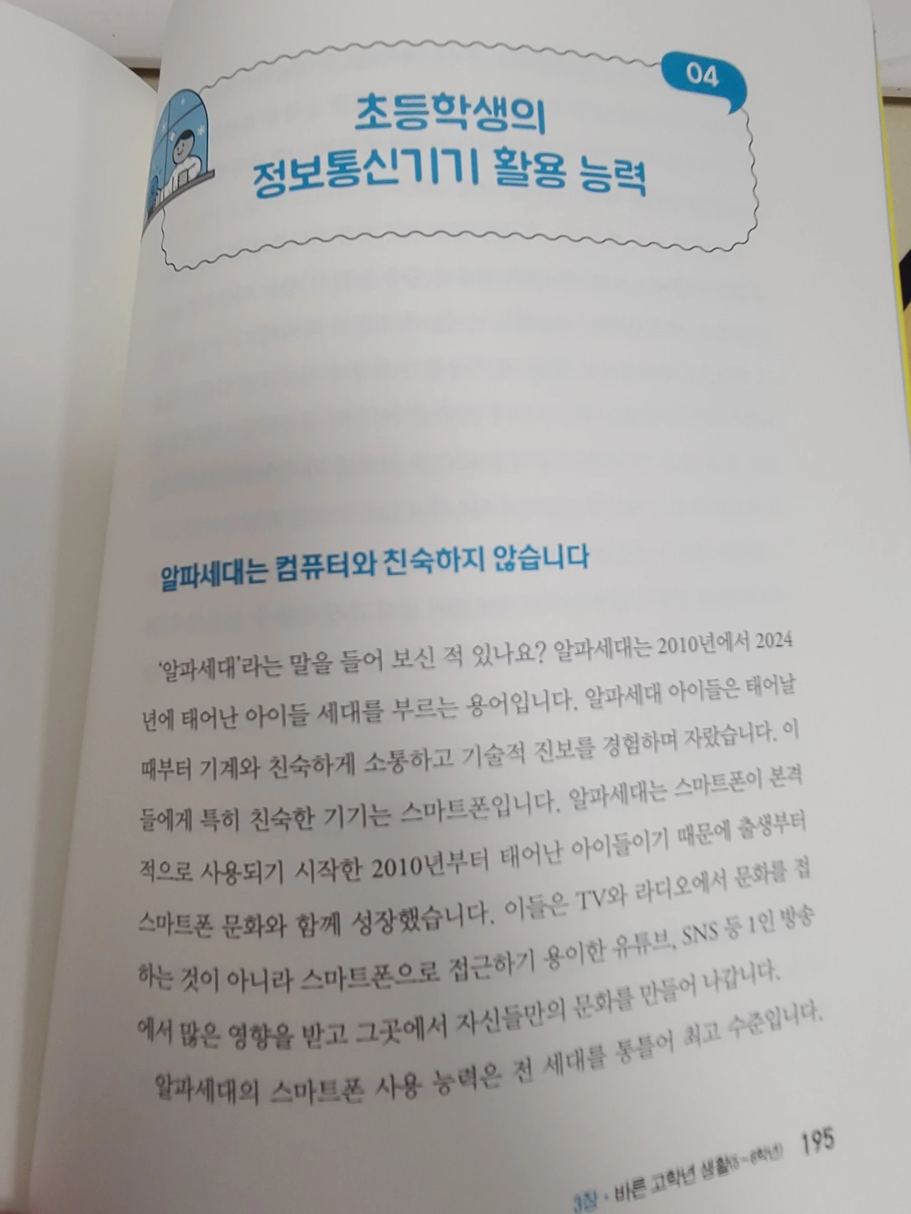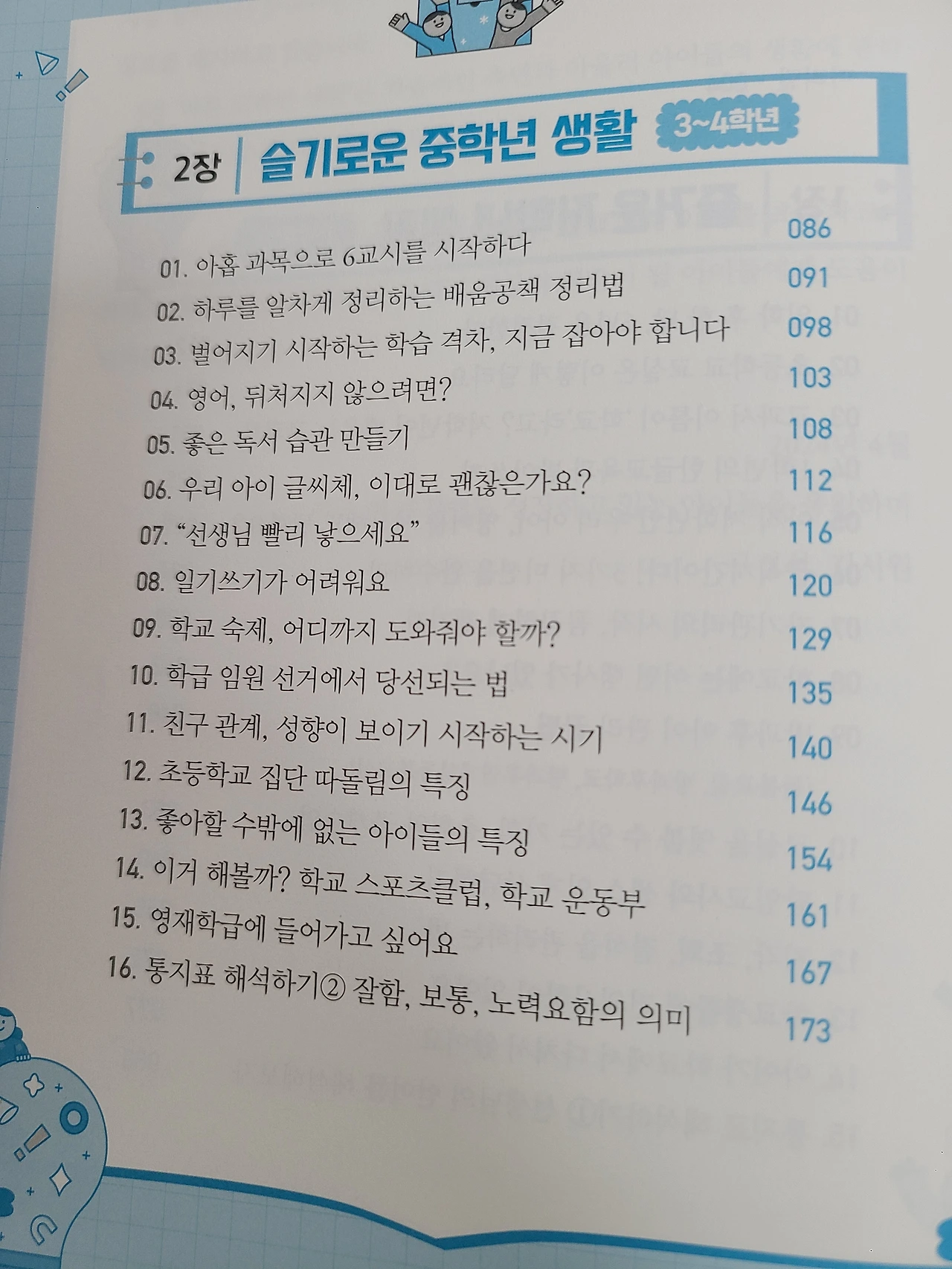 그렇게 1, 2학년 저학년 생활을 슬기롭게 맞이하는 요령을 터득하고 2장에선 3, 4학년 중학년 생활을 슬기롭게 대응하는 방법을 설명해 준다. 요즘 가장 뜨거운 감자인 '문해력'에서부터 기존 교과에 대한 학습 능력 신장을 위한 아이디어가 고스란히 녹아들어 가 있다. 이는 현장에서 선생님들이 학생들과 함께 교실에서 적용해 본 프로그램들이기에 그 효과성에 대한 의구심은 자연스럽게 사라진다. 또한 시대의 흐름에 다소 어긋나는 전통의 방식이 아닌 학생 개개인의 발달 특성에 맞고 학생들이 스스로 흥미와 관심을 꾸준히 학습할 수 있도록 고안한 프로그램이 많다. 읽는 내내 지겹지가 않고 배우고 익히게 되는 부분이 많은 챕터 중 하나였다.