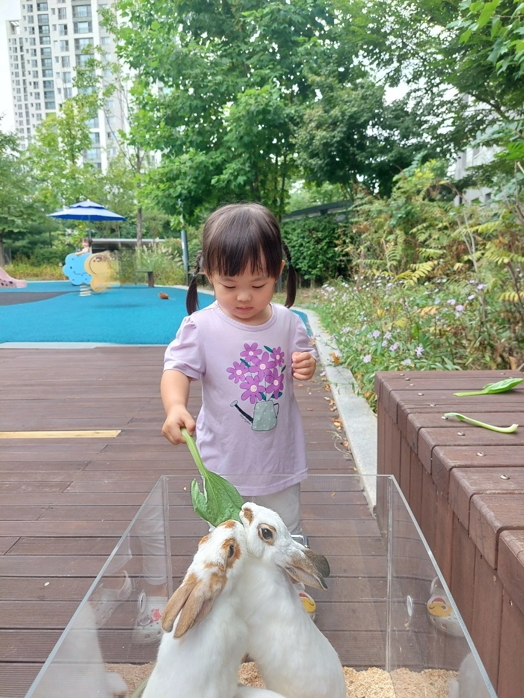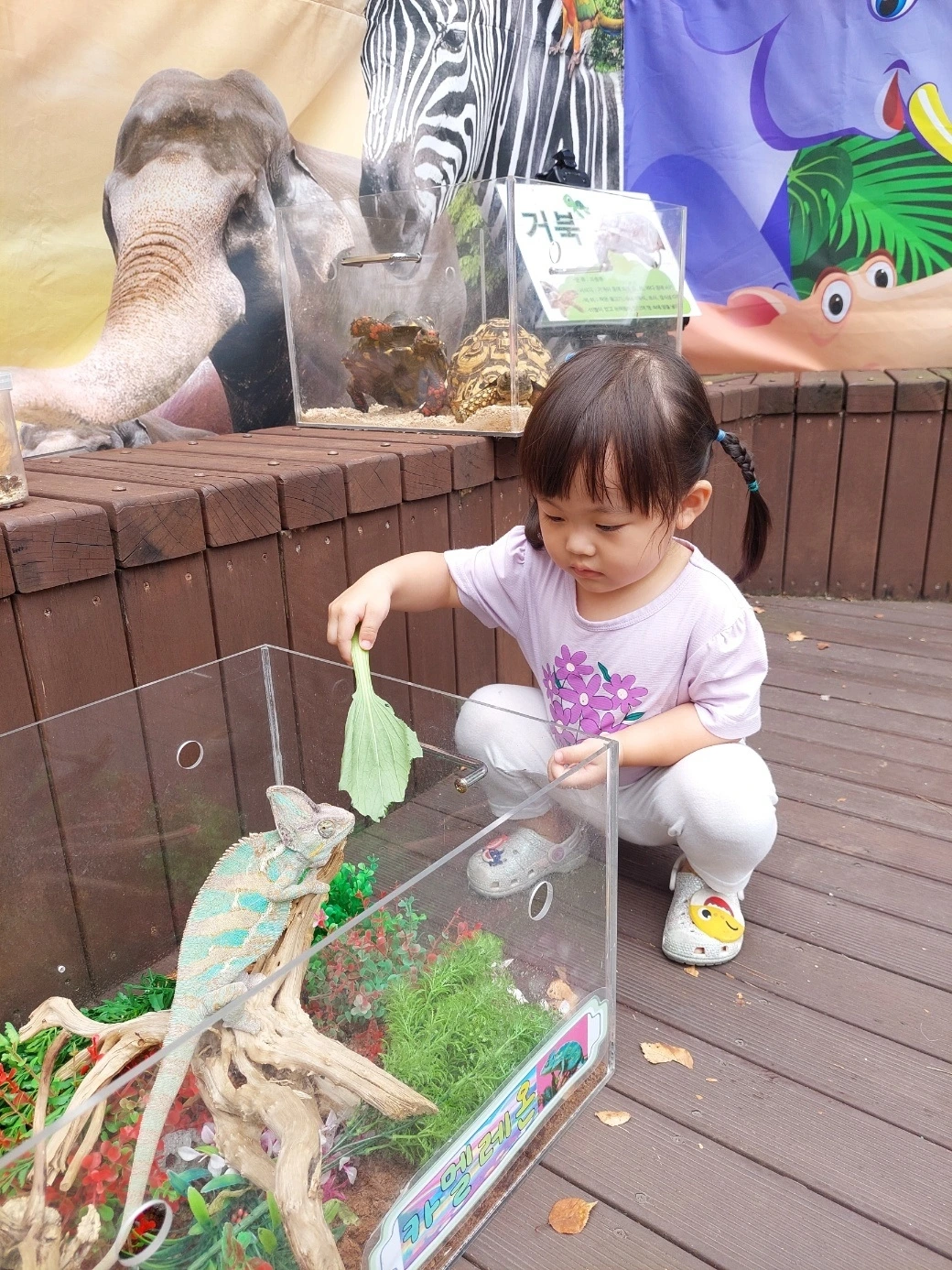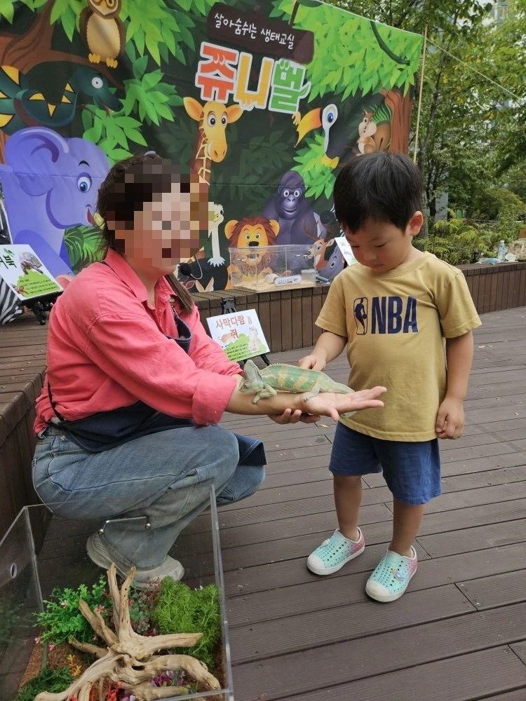 그리고 허니는 한 가지 더 재미있고 뜻깊은 시간을 어린이집에서 보냈는데요. 그것을 바로 '찾아가는 동물 수업'이었습니다. 동물조련사 분들이 직접 아이들의 흥미와 눈높이에 걸맞은 작은 동물 친구들을 데리고 어린이집에 놀러 온 것인데요. 생명을 존중하고 사랑하는 마음과 더불어 직접 손으로 만져도 보고 먹이도 주면서 교감하는 모습이 인상적인 시간이었습니다. 도심에 살면서 반려동물을 제외한 양서류, 파충류 등을 경험하기가 쉽지 않은 터라 이번 동물보호교육은 아이들에게 꽤 유익한 순간이지 않았을까 하는 생각입니다. 동물을 다소 무서워하고 특히 지나가는 새만 봐도 울먹이던 허니가 씩씩하게 용기를 내서 동물들과 교감하는 모습을 보니 제법 컸구나라는 느낌도 함께 받았습니다.