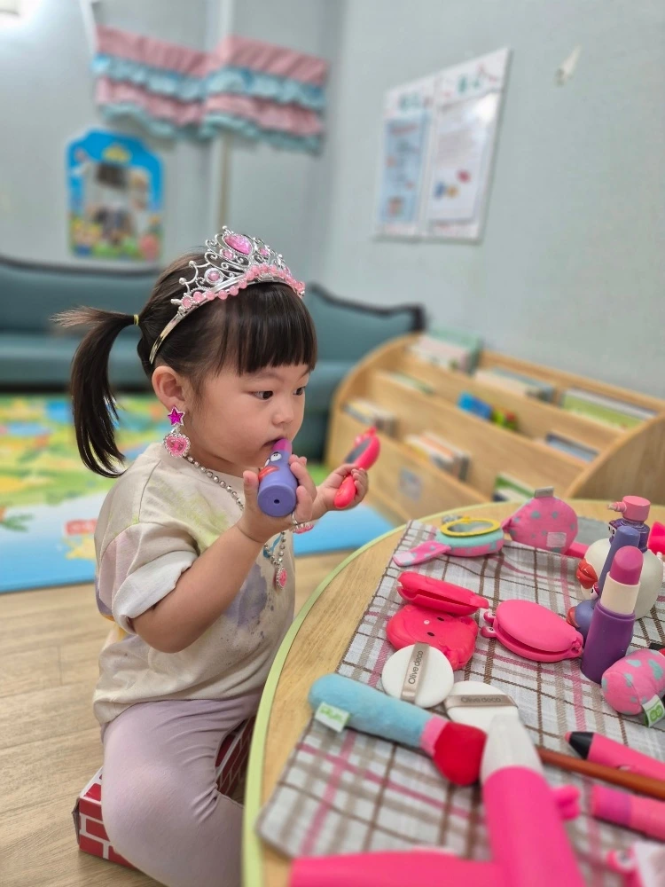 같은 시각, 만 1세 반 달콤이는 (이제는 만 2세이긴 하지만) 어린이 집에서 재미있는 공작 활동과 역할놀이 수업을 받았습니다. 오빠의 영향 때문인지 집에서 로봇 흉내를 내기도 하고 '출동', '변신' 등의 남아에게 어울릴 법한 단어에 익숙한 아이지만 천상 '도시 여자'의 본성을 숨길 순 없나 봅니다. 평소에 엄마가 화장하는 모습을 유심히 보고, 키즈카페에서도 화장대 놀이를 해 본 경험이 있어서 그런지 분장 도구를 다루는 모습이 꽤나 자연스럽고 익숙한 모양새입니다. 마지막에 머리도 빗고 헤어 드라이기까지 능숙하게 사용하였다고 하니 이젠 배변 활동만 스스로 할 수 있다면 영락없는 어린이로 성장할 것 같습니다.