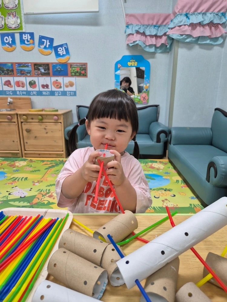 매주 진행되는 '아띠랑 코코' 시간에는 빨대를 활용하여 막대에 끼워보는 활동을 하였습니다. 휴지심에 직접 빨대를 키워 간단한 작품을 만들어보기도 하고 좋아하는 색깔별로 막대에 꽂아 자유롭게 배치하기도 해 보았는데요. 손과 눈의 협응성을 기를 수 있고, 배색에 대한 개념을 자기 스스로 찾아갈 수 있다는 점에서 유익한 시간이지 않나라는 생각을 해보았습니다. 끼우고 꽂을 때마다 선생님께서 칭찬해 주시니 연신 흐뭇해했다는 선생님과 래포 형성이 잘되었구나라는 것도 느끼고 선생님의 노고에 무한한 감사를 드리게 되는 순간이었습니다.