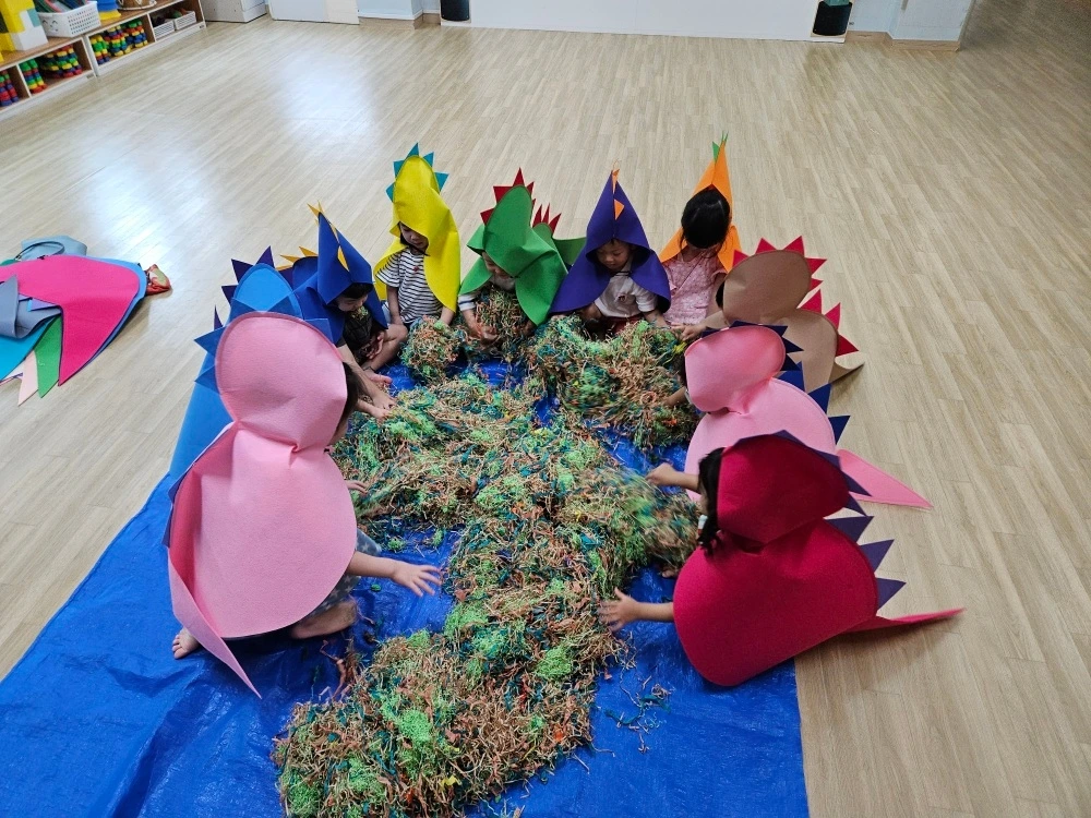 만 3세 허니는 월요일 아침부터 귀여운 공룡으로 변신하였습니다. 매주 월요일마다 진행되는 위드팡팡 활동을 한 것인데요. 공룡이 살던 시기(백악기 시대라고나 해야 할까요...?)로 거슬러 올라가 직접 공룡이 되어 먹이를 먹고 공룡의 습성을 직접 몸으로 표현하는 시간을 가졌습니다. 이미 티라노 사우르스를 위시한 여러 종류의 공룡에 대하여 유튜브를 통해 예습(?)이 충분히 되었던지라 허니는 자신 있게 공룡의 모습을 마음껏 뽐내었다고 하는군요. 저도 어렸을 때 제법 공룡에 관심이 많았던 터라 아들의 모습에서 저의 어린 시절을 잠깐 되새겨 보는 순간이기도 했습니다.