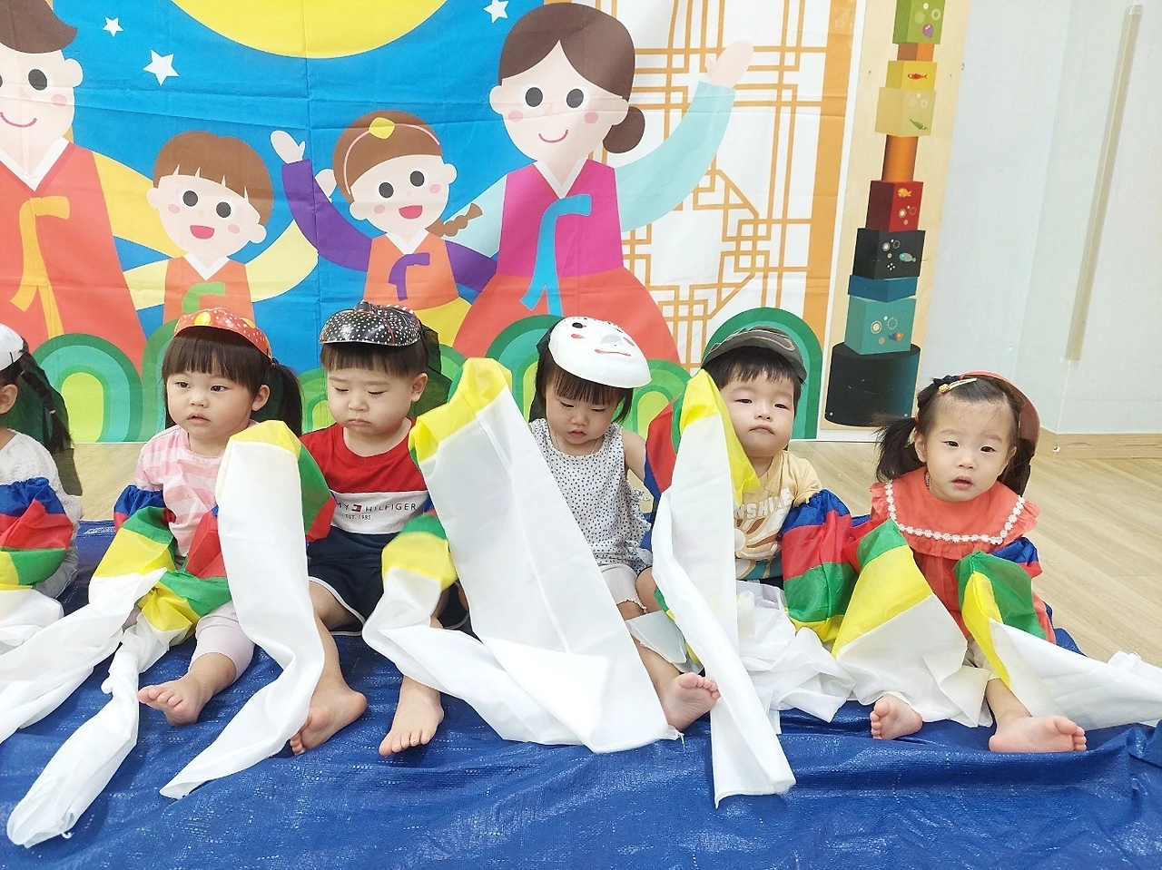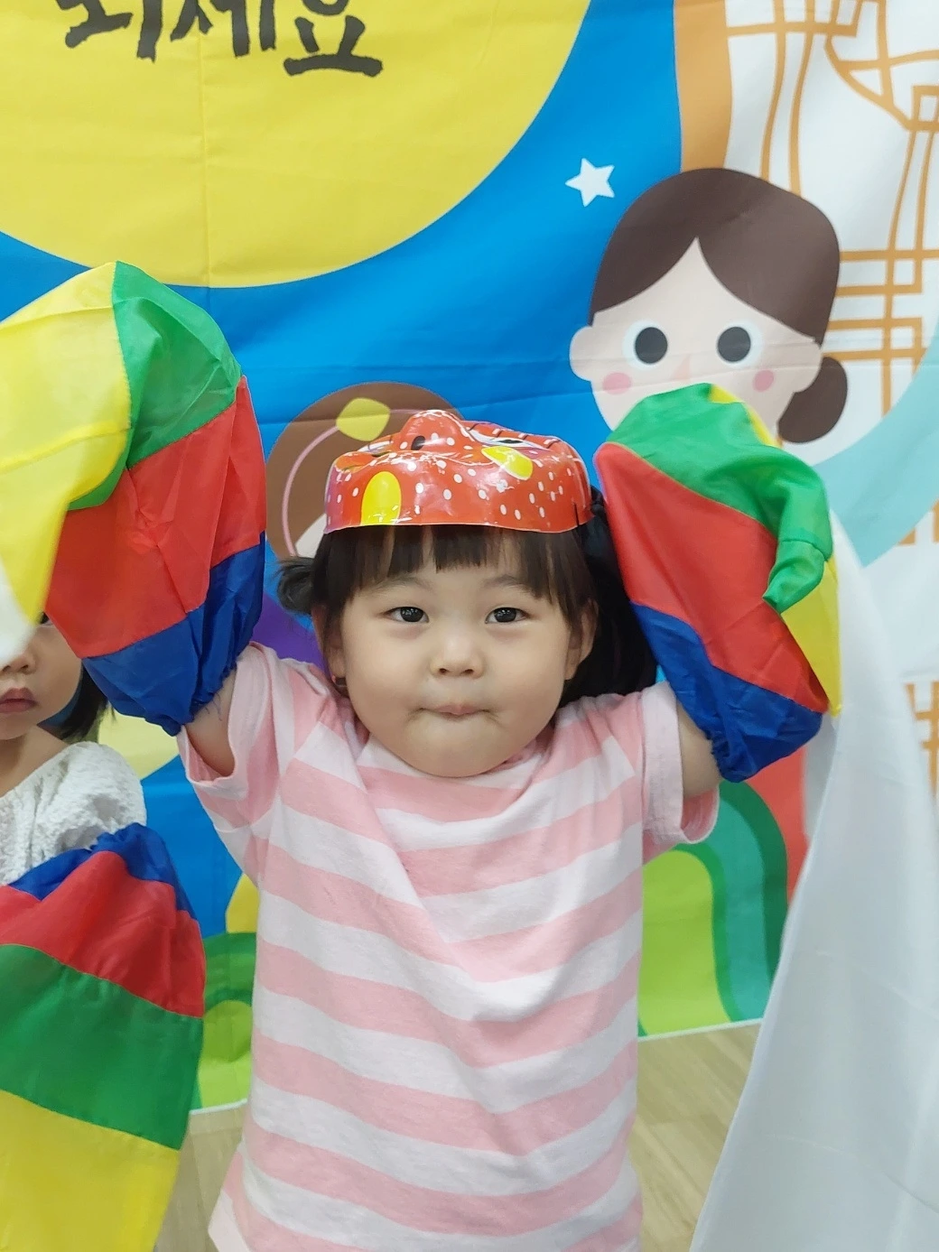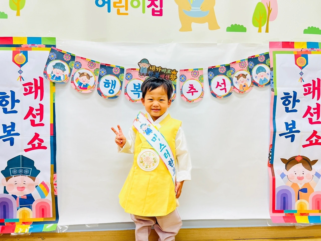 그리고 목요일 달콤이도 다른 어린이집 학생들과 마찬가지로 '추석 행사 및 한복 페스티벌'을 맞이해 즐거운 시간을 보냈습니다. 난생처음 입어보는 추석빔이 아름다운지 선생님과 친구들에게 "나 멋지지?" "저 멋지죠?"를 입이 닳도록 자랑했다고 하네요. 달님을 쳐다보면서 '우리 가족 모두 건강하게 해 주세요'라고 소원도 빌어보고 제기차기, 윷놀이, 떡메치기 등의 전통 민속놀이를 하며 추석이라는 명절에 대해 조금이나마 이해하게 되는 순간이었습니다.