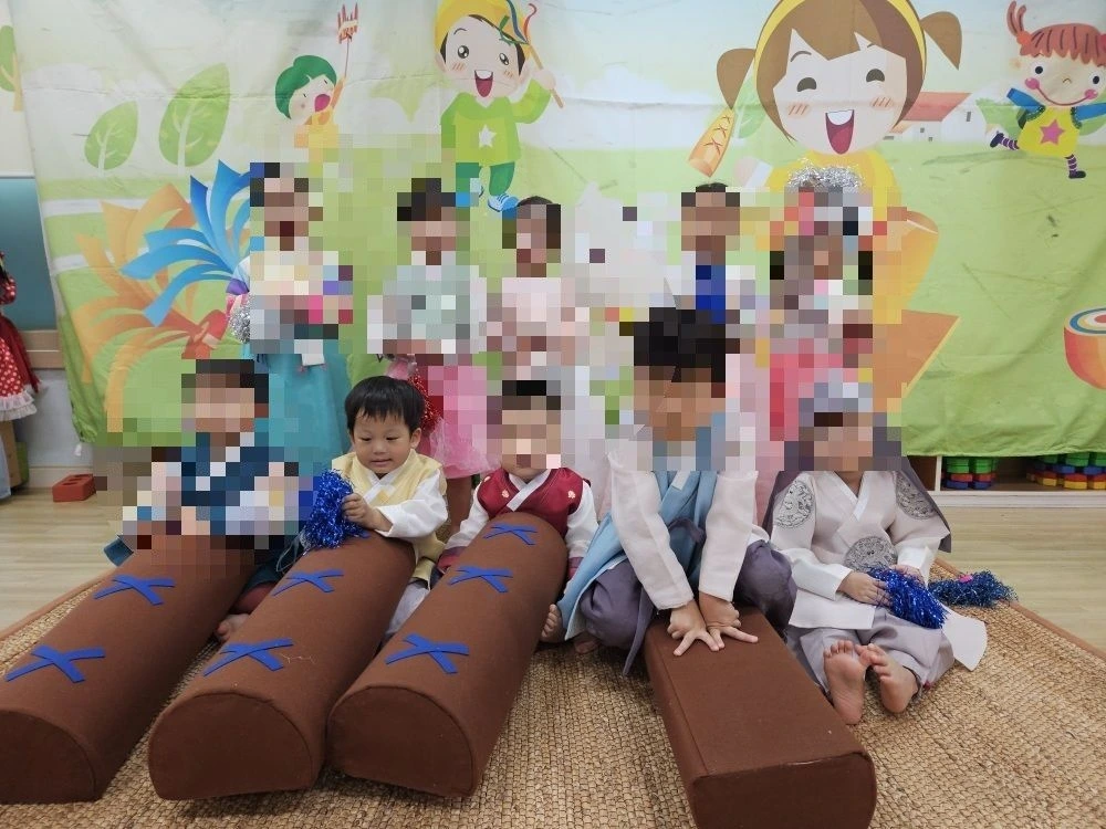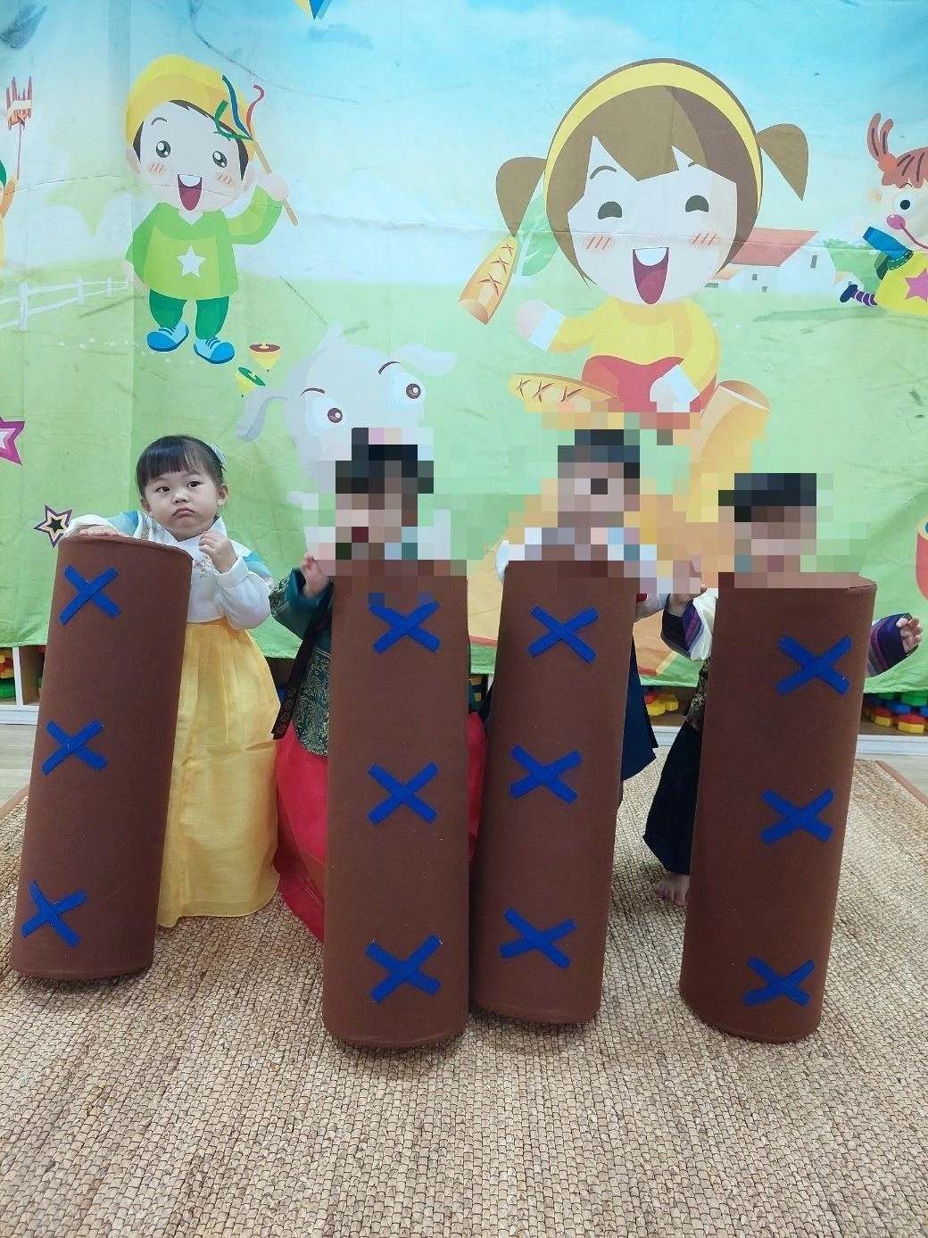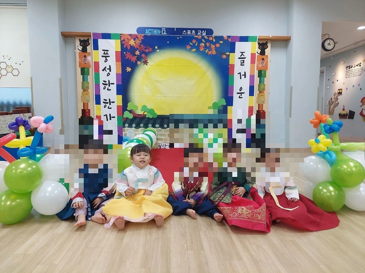 그리고 목요일 달콤이도 다른 어린이집 학생들과 마찬가지로 '추석 행사 및 한복 페스티벌'을 맞이해 즐거운 시간을 보냈습니다. 난생처음 입어보는 추석빔이 아름다운지 선생님과 친구들에게 "나 멋지지?" "저 멋지죠?"를 입이 닳도록 자랑했다고 하네요. 달님을 쳐다보면서 '우리 가족 모두 건강하게 해 주세요'라고 소원도 빌어보고 제기차기, 윷놀이, 떡메치기 등의 전통 민속놀이를 하며 추석이라는 명절에 대해 조금이나마 이해하게 되는 순간이었습니다.