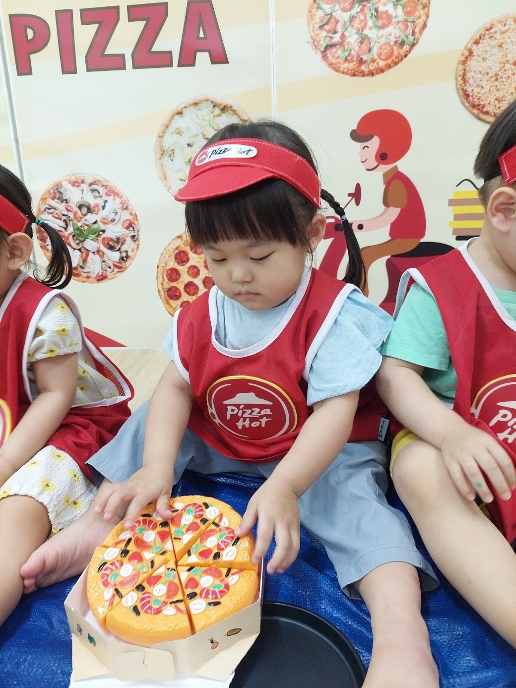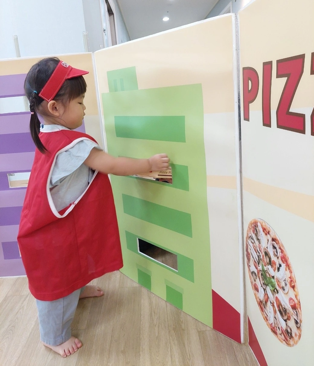같은 시각, 만 2세 달콤이는 월요일 아침부터 아르바이트(?)를 하느라 굉장히 분주한 모양새입니다. 오감놀이 대체 수업의 일환으로 '피자 가게에서 일해요'라는 수업을 들었는데요. 피자 모형 놀잇감을 가지고 팬에 하나씩 옮기기도 하고 상자에 담아 포장하면서 배달까지 수행하는 역할놀이를 하였습니다. 평소에도 가게놀이에 일가견이 있는 달콤이 인지라 "영수증 필요하세요?" , "카드로 계산하시겠어요?"라는 말을 하면서 실제와 거의 구별이 안 갈 정도로 역할 놀이에 몰입했다고 하네요. 평소에 열심히 놀아주면서 페이 결제까지 상황극에 투입한 보람이 있는 듯합니다.