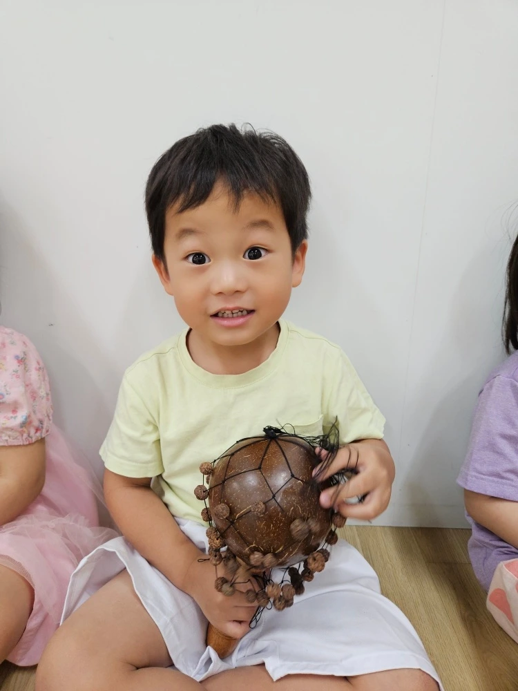 화요일 스토리 오감 시간에는 추석을 맞이하여 색동 한삼자락을 갖추어 우리나라 장단 리듬에 맞춰 노래도 하고 춤도 추는 시간을 가졌습니다. 길게 자른 색한지 종이를 이용해 날리기, 던지기, 뿌리기 등을 하며 한지라는 존재에 익숙해지는 활동을 했고요. 직접 탈도 써보고 선생님의 지도에 따라 '북청사자놀음'의 일부를 몸으로 표현했는데 선생님이 쓰신 사자탈이 너무 실제와 비슷해서 아이들이 흠칫 놀라기도 했다는 후문이네요. 하지만 호랑이띠인 아이들이라 그런지 이내 놀란 가슴을 쓸어내리고 재미있게 나머지 활동까지 잘 마무리 지었답니다.