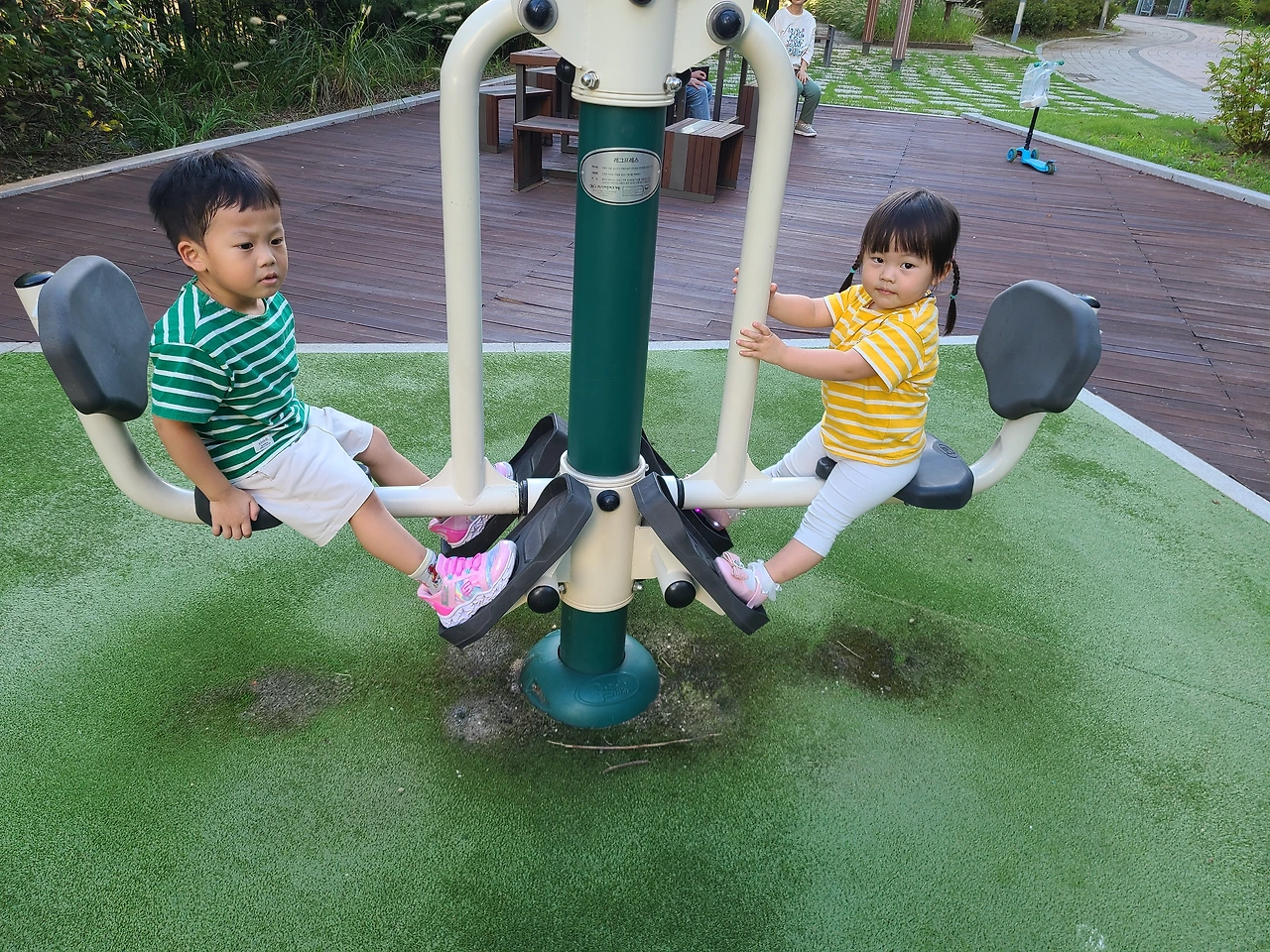 한낮을 제외하고 아침저녁 간에 제법 시원함과 쌀쌀함 사이 그 어딘가가 은근하게 느껴지는 요즈음입니다. 그 덕분에 하원 후 놀이터가 모처럼만에 활기를 띠기 시작했습니다. 불과 며칠전만 해도 35도를 넘나드는 가을 폭염 탓에 한산하기 이를 데 없는 놀이터였는데 말입니다. 허니와 달콤이도 어린이집 하원 후 단지 내 놀이터 이곳저곳을 돌아다니면서 친구들과 즐거운 시간을 보냅니다. 분명 몇 분 전까지만 해도 같은 반에서 하루종일 함께 했던 친구들인데도 밖에서 만나면 무척이나 반가운 모양입니다. 과연 이번주는 허니와 달콤이는 어린이집에서 또 어떤 재미난 활동을 경험했을까요?