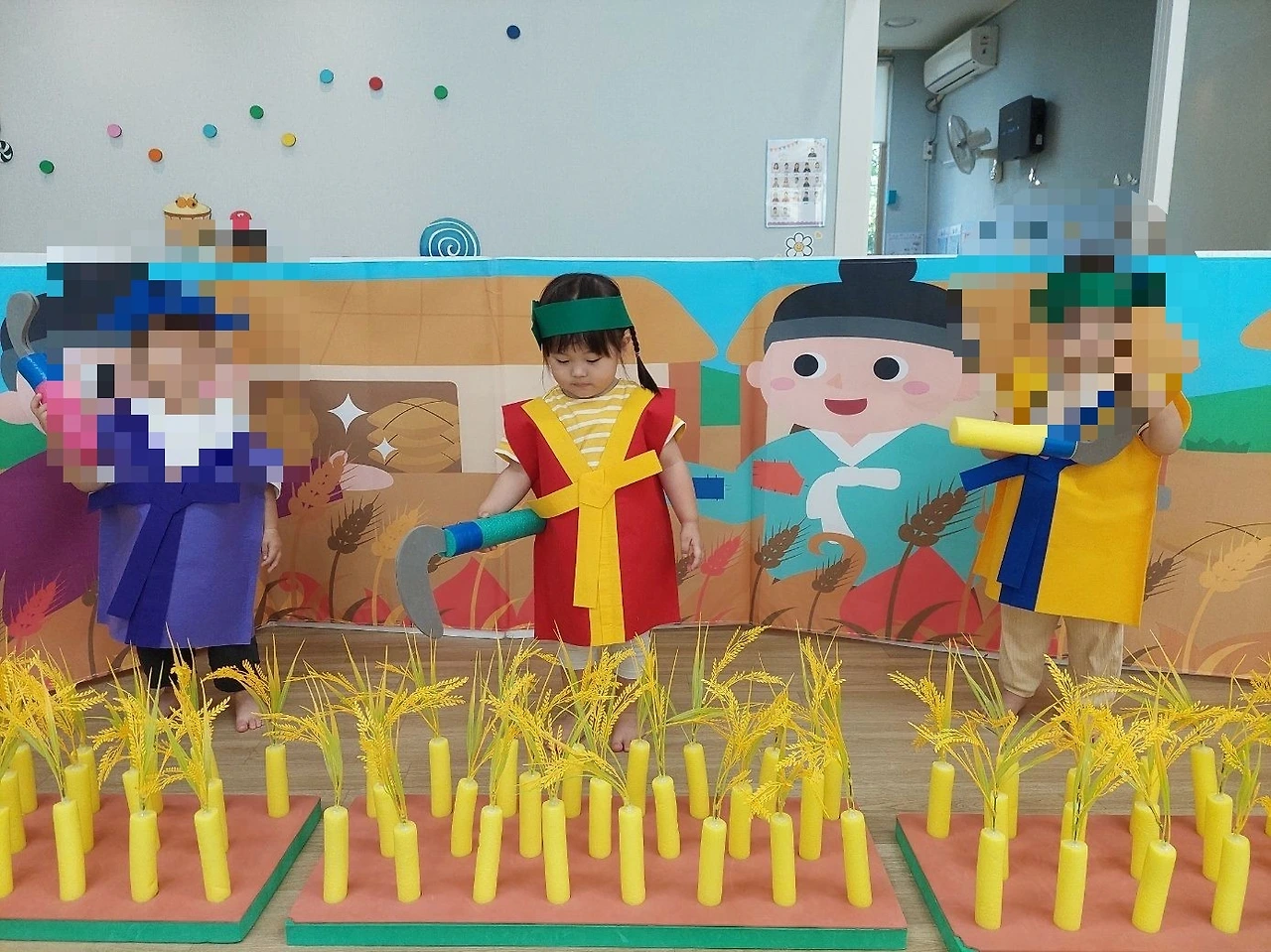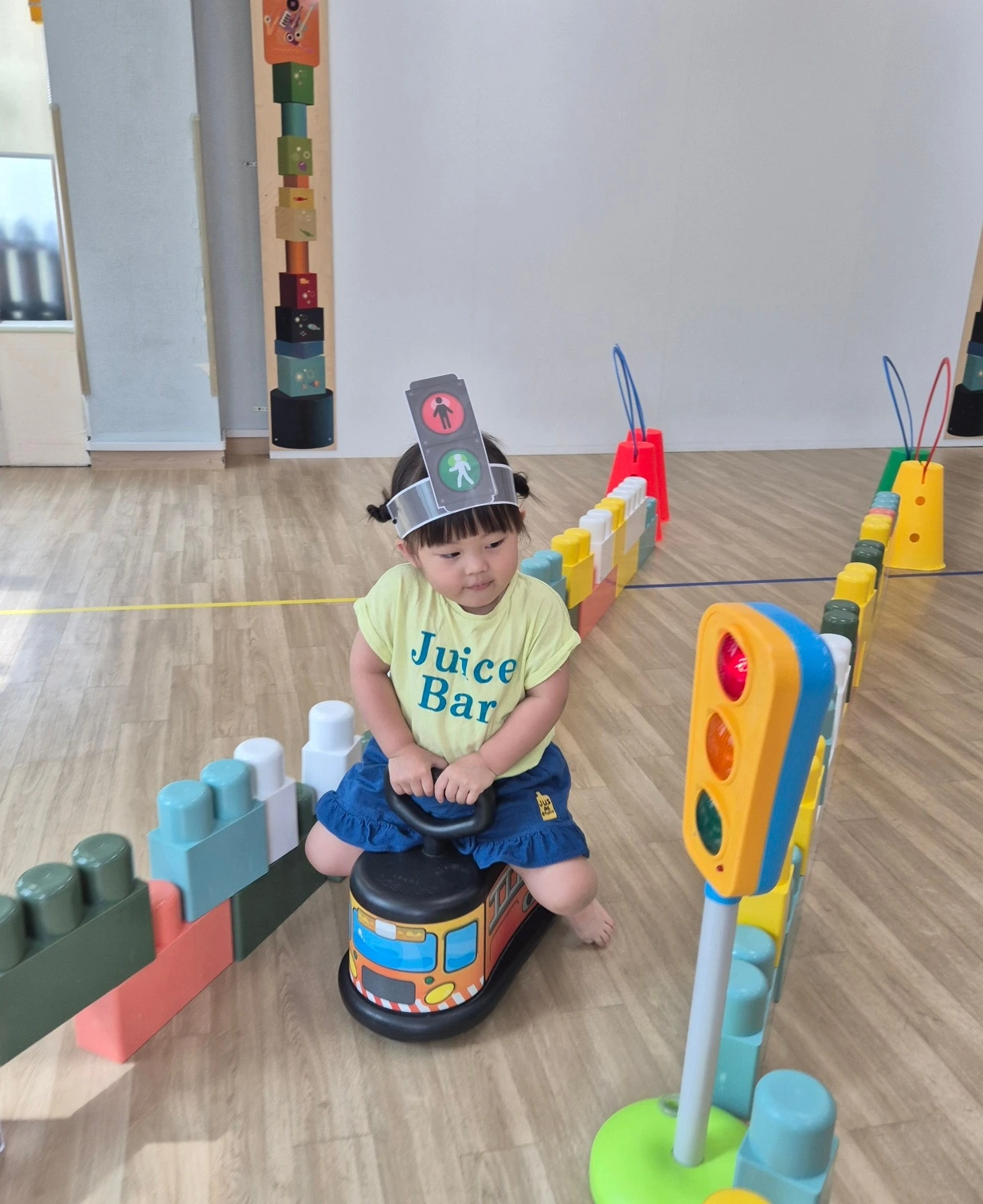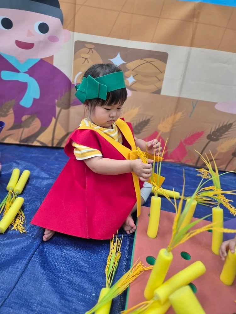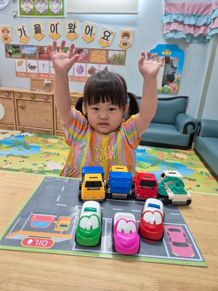 같은 시각, 만 1세 반 달콤이(만 2세)는 스토리오감 시간에 늠름한 농부로 변신을 했습니다. 친구들과 모형 낫을 활용해 노랗게 익어 고개를 숙인 모형 벼를 수확하는 활동을 하였습니다. 벼가 자라 쌀이 된 후 우리 식탁에 밥으로 나타나는 일련의 과정은 이해하기 어렵지만 농부 아저씨 덕분에 우리가 맛있는 밥을 먹을 수 있다는 것을 간접적으로 느낀 달콤이와 친구들입니다. 또한 탈 것에 대한 안전 교육의 일환으로 모의 운전 연습과 주차를 배워보는 시간을 가졌습니다. 운전자의 입장에서 지켜야 할 안전 수칙과 교통 법규에 대해서 배우고 주차할 때 주의해야 할 점을 장난감으로도, 역할 놀이로도 알아보면서 일상생활에서 꾸준히 상기하리라는 다짐까지 하였습니다.