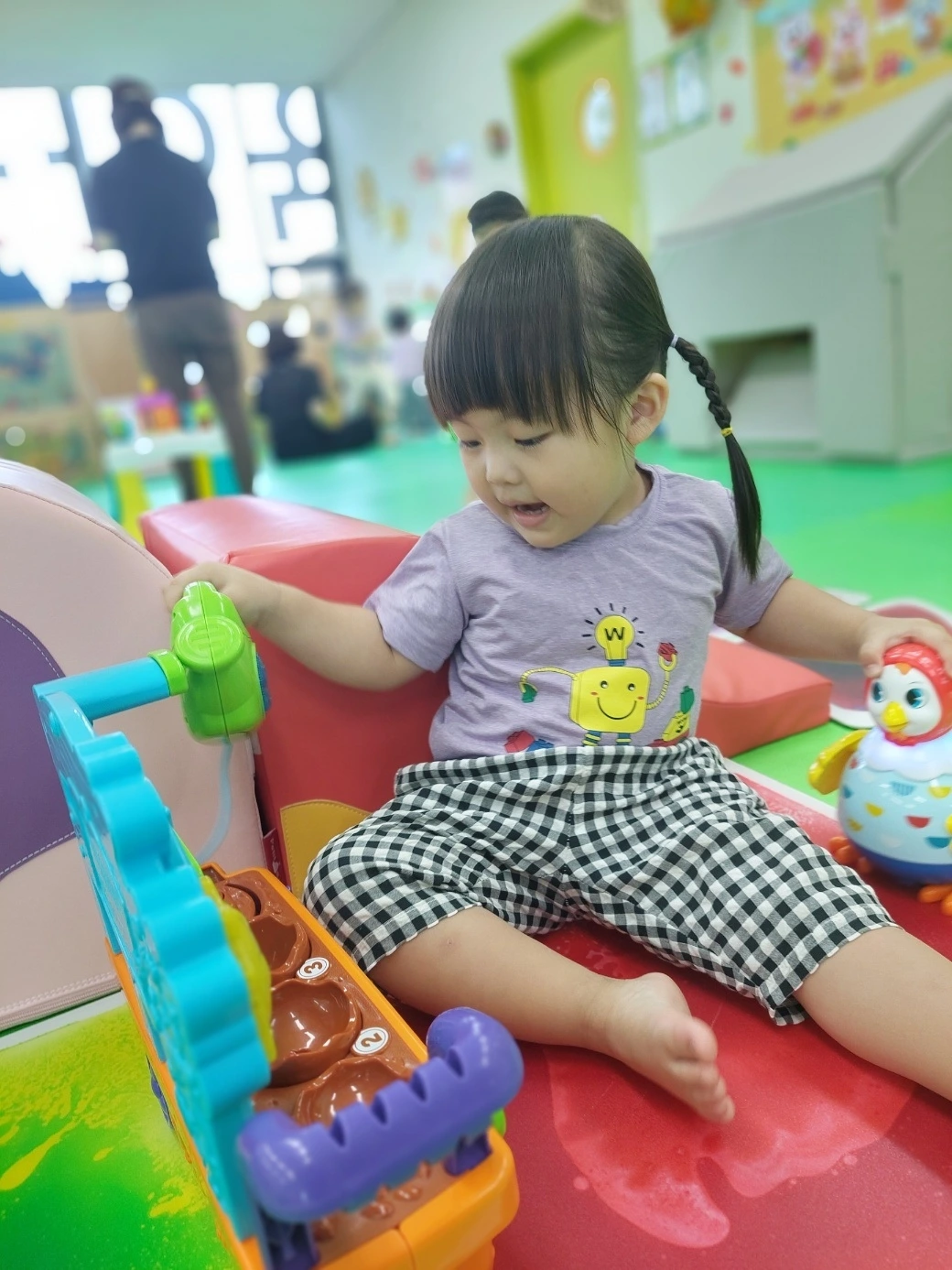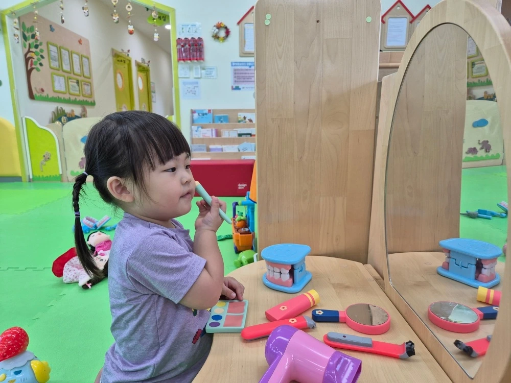 그리고 달콤이가 가장 좋아하는 '실내 놀이터' 방문도 진행하였습니다. 평소에 놀이터나 키즈 카페를 방문하면 아이스크림 가게 놀이, 마트 놀이 등 주로 물건 사고팔기를 우선적으로 관심을 갖던 달콤이. 요즘에는 관심사가 바뀌었는지 화장대와 싱크대부터 찾습니다. 화장대 거울을 보며 각종 화장 도구들을 가지고 노는 모양새가 예사롭지 않습니다. 엄마가 화장하는 모습을 평소부터 유심히 보던 성과(?)가 빛을 발하는 순간인지 모르겠습니다. 싱크대는 아무래도 아빠가 설거지하는 모습을 자주 봐왔기 때문이 아닐까 싶네요. 그렇게 혼자서도 잘 놀고 친구들과 야무지게 트램펄린도 타면서 멋지고 신나는 하루를 보냈습니다.