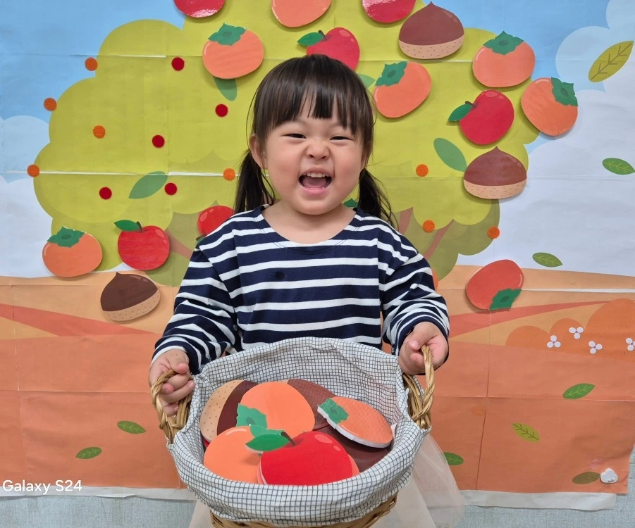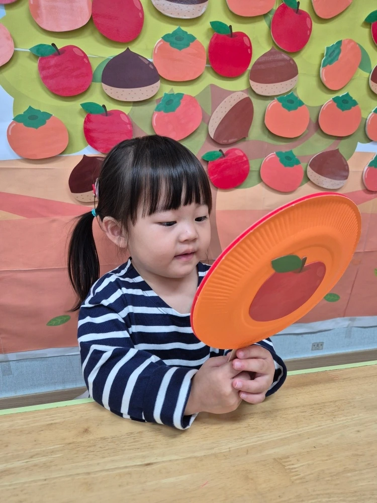 같은 시각 만 1세 반 달콤이는 가을 풍경 꾸미기 놀이에 한창 빠져있었습니다. 알록달록 빨갛고 주황빛으로 물든 교구를 가지고 손거울을 만들기도 하고, 형형색색의 과일 모형을 바구니에 무리 짓기 하는 활동울 하였습니다. 파안대소하는 표정까지 보너스로 제공하면서까지 말이죠.