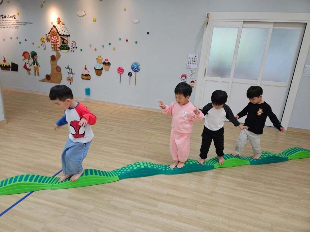 그리고 금요일 오후 체육 시간에는 친구들과 함께 평균대를 오르내리는 시간을 보냈습니다. 다양한 높낮이와 모양으로 자리한 평균대를 이리저리 오르내리며 신체 균형 감각을 기르고 또한 눈과 손, 발의 협응력을 신장시키는 활동이었습니다.
